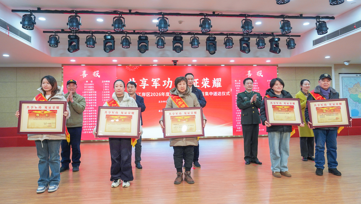 一张张红彤彤的喜报,一声声真挚的祝贺,映红了大江金岸。2月4日下午3时,“共享军功·见证荣耀”——武汉市暨江岸区2026年度现役军人立功喜报集中送达仪式,在武汉市退役军人服务中心温情启幕,39个军人之家在这一刻共享荣光。