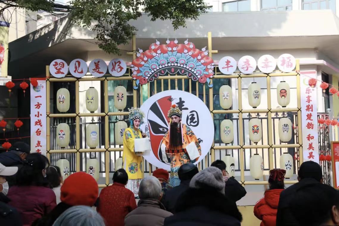 2月4日上午,武汉市东西湖区吴家山街道望丰社区烟火巷口举办了“丰园聚国粹”戏曲文化专场表演。活动现场设有戏曲演出、剪纸、藤编、写对联、义剪等摊位,吸引了众多居民参与。