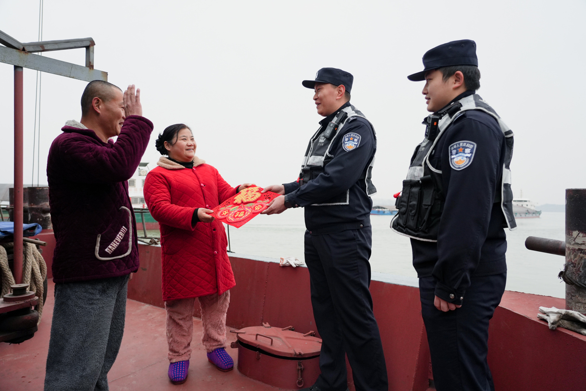 2月4日下午,一艘巡逻艇驶进黄石西塞山锚地,民警们登上船头,把福字送到船员手中,也把新春祝福和安全提示一起送到了船员心中。在亲切交谈中,船员黝黑的脸上露出笑容:“我还是第一次在船头收到福字,心里热乎!”