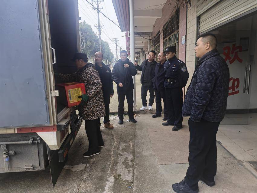 “面包车紧邻商铺,安全隐患极大。”当天,庙山所民警马不停蹄,继续核查下一条群众举报线索。在一家副食批发店门口,民警发现一男子正从一辆面包车上搬运烟花爆竹进行交易,现场查获烟花爆竹5件、25盘。面对突然出现的民警,该男子对其违法行为供认不讳。