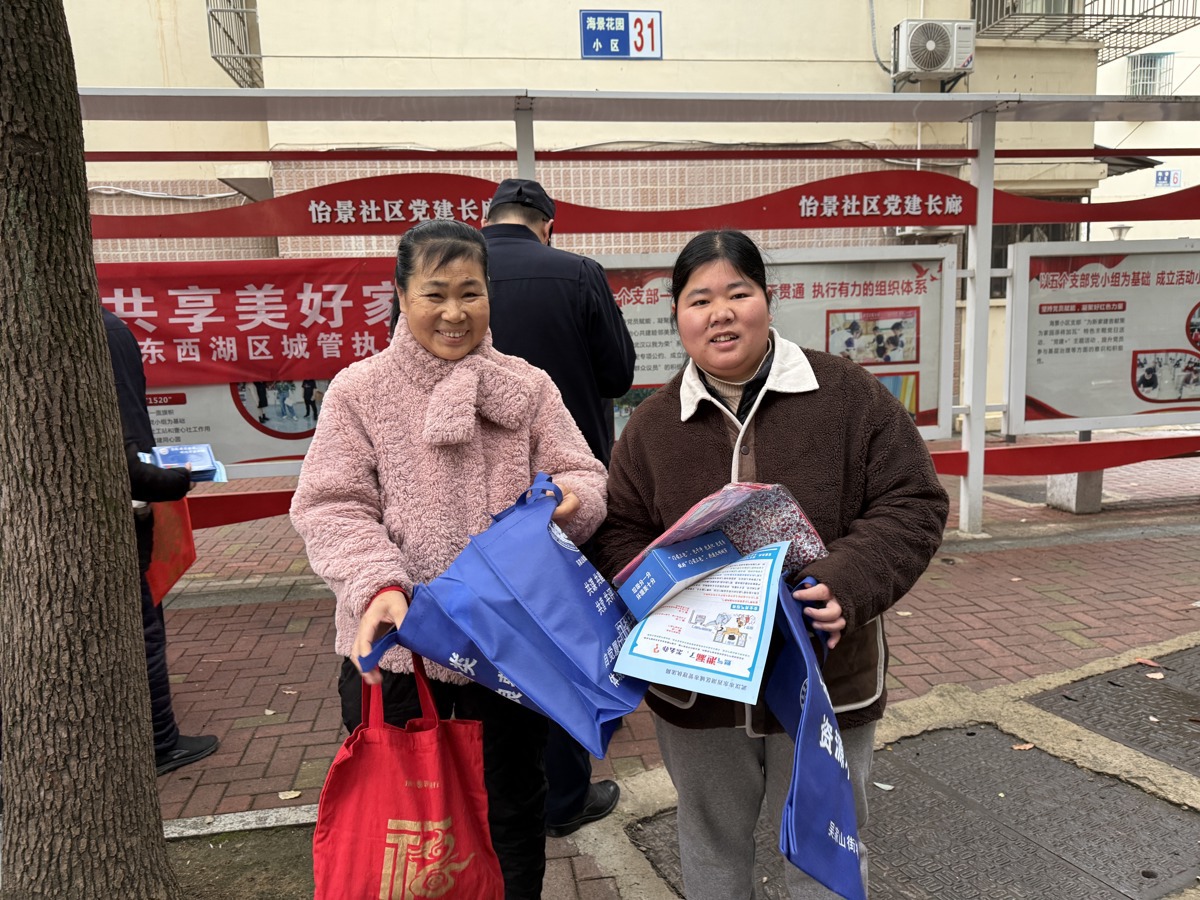 不远处,互动问答区传来阵阵笑声。“我知道!‘门前三包’就是包卫生、包绿化、包秩序!”一位大妈抢答成功,乐呵呵地接过一个印着蓝色的环保袋。围裙、雨伞这些实用小奖品,加上接地气的问题,让现场变成了热闹的社区小课堂。居民张爹爹拿着奖品,笑眯了眼:“这活动好,不像光是来管我们的,倒像是来拉家常、送服务的。”