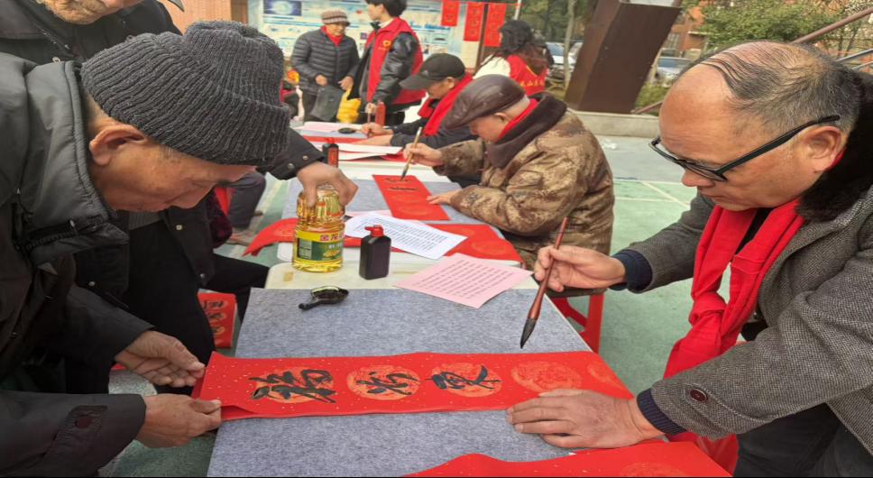 活动现场热闹非凡,书法爱好者挥毫泼墨,笔走龙蛇,一副副寓意吉祥的春联、一张张饱含祝福的福字跃然纸上,居民们有序排队领取,脸上洋溢着幸福的笑容。