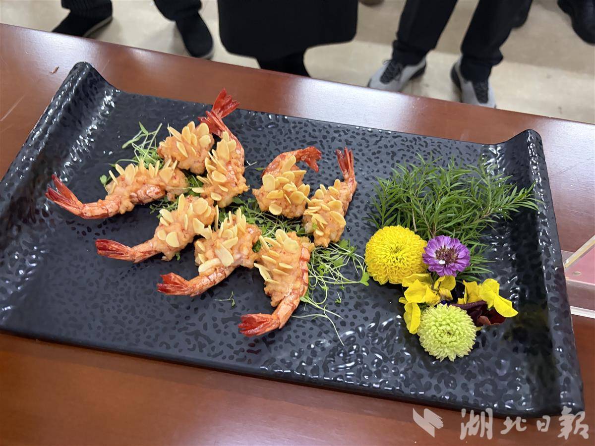 四号选手何大厨的“荔枝虾球”成了全场焦点。他用火龙果汁给生粉上色,裹住鲜虾仁,炸后形如玫瑰,酸甜可口。他说:“做法不复杂,孩子爱吃,学校食堂完全可以做。”