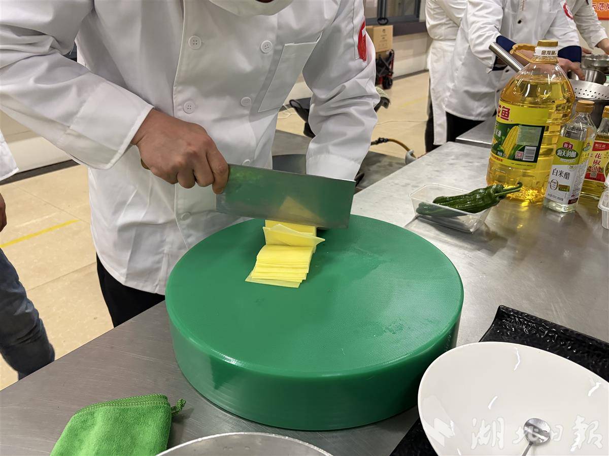 本次比赛主题是“传承饮食文化·创新健康美味”。主办方希望以赛促优,提升校园餐食质量,守护学生“舌尖上的安全”。必考菜是家常的青椒土豆丝。看似简单,实则考验刀工、火候和调味。有的大厨加入胡萝卜丝,颜色更亮、营养更全;有的搭配莴笋,口感更清爽;还有的用秘制酱料提味,让评委连连点头。