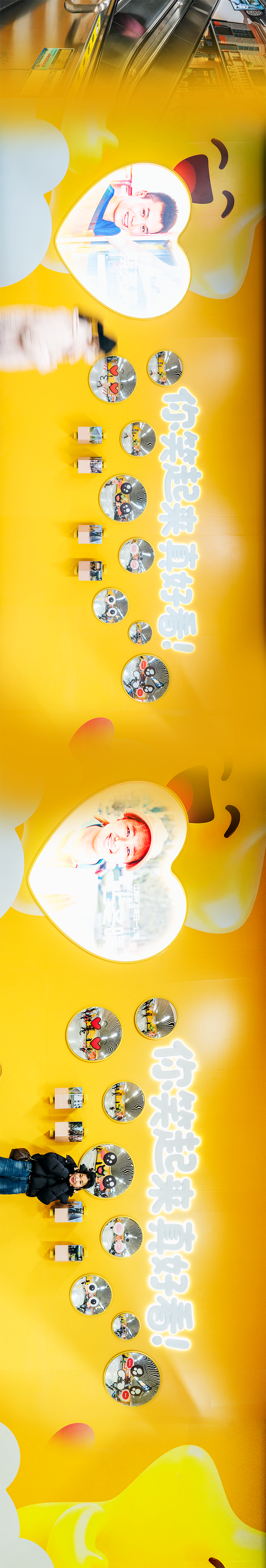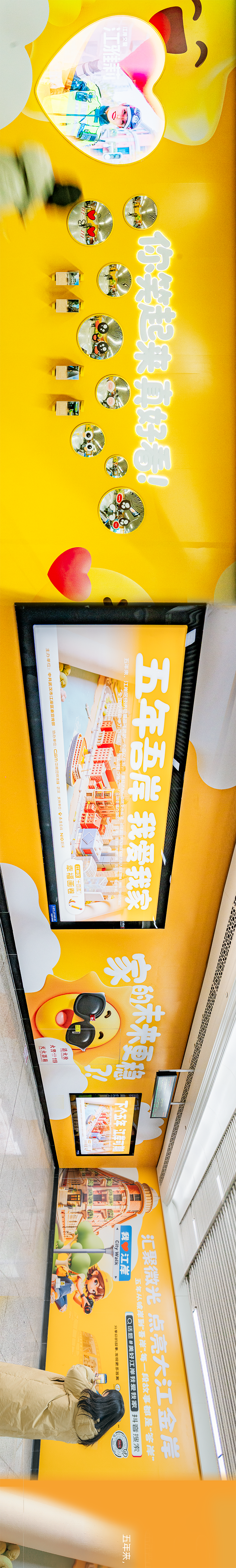 这里不仅有趣味展陈,设置了沉浸式互动区。在“你笑起来真好看”主题墙前,凹凸镜与笑脸相映,期待你与自己、与江岸的温暖瞬间同框。沿扶梯而上,数字化屏幕上的人物仿佛与你并肩同行,一路光影相伴,步履生趣。