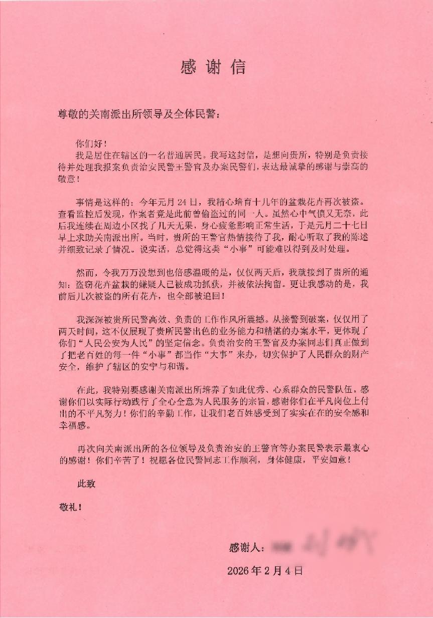 “才两天,被盗的盆栽就找回来了!”2月4日下午,68岁的刘婆婆攥着一封写给关南派出所王立雄警官的感谢信,匆匆走进武汉市公安局东湖新技术开发区分局,言语间满是激动。这封信的背后,藏着一段民警快破盗窃案、为老人纾困的暖心故事。