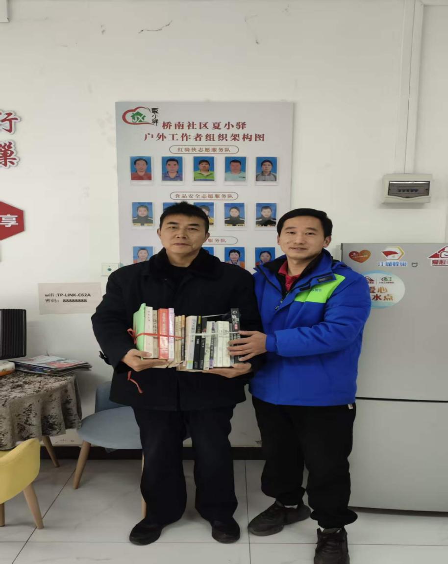 2月5日中午,武汉市江夏区大桥经济开发区桥南社区红骑侠志愿服务队宣传员李鹏程,为辖区户外工作者驿站捐赠各类书籍,用脉脉书香为一线户外工作者献爱心。