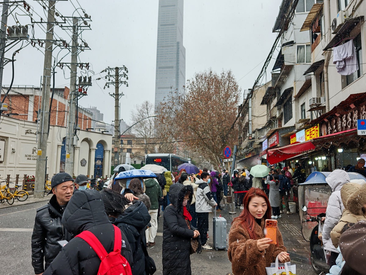 上午9时40分许,天空悄然飘起雪花。纷纷扬扬的雪粒轻轻洒落,覆上屋檐街角。正在排队的游客们不禁驻足,有人伸手迎接雪花,有人走出店铺在街头拍照留念。雪花与蒸汽交融、寒意与香气交织,游人的欢笑声此起彼伏,让这条雪中的老街充满了生动而温馨的节日气息。