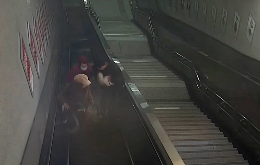 1月28日下午4时30分,两名乘客从地铁7号线板桥站出站后前往C口,前方女士推着儿童车,后方先生怀抱着熟睡的幼儿,一前一后踏上手扶电梯。这看似平常的一幕,却在几秒内骤然惊险——前方乘客因未站稳,身体失衡向后倒去!