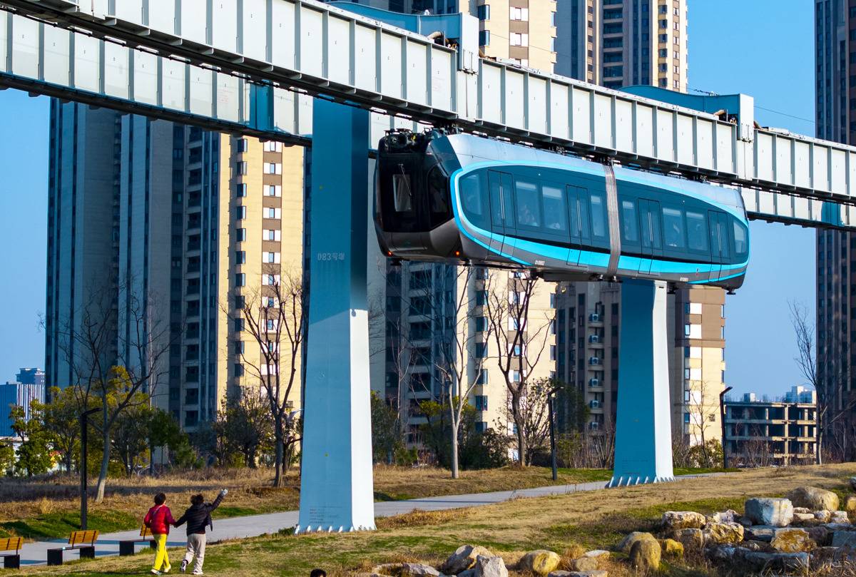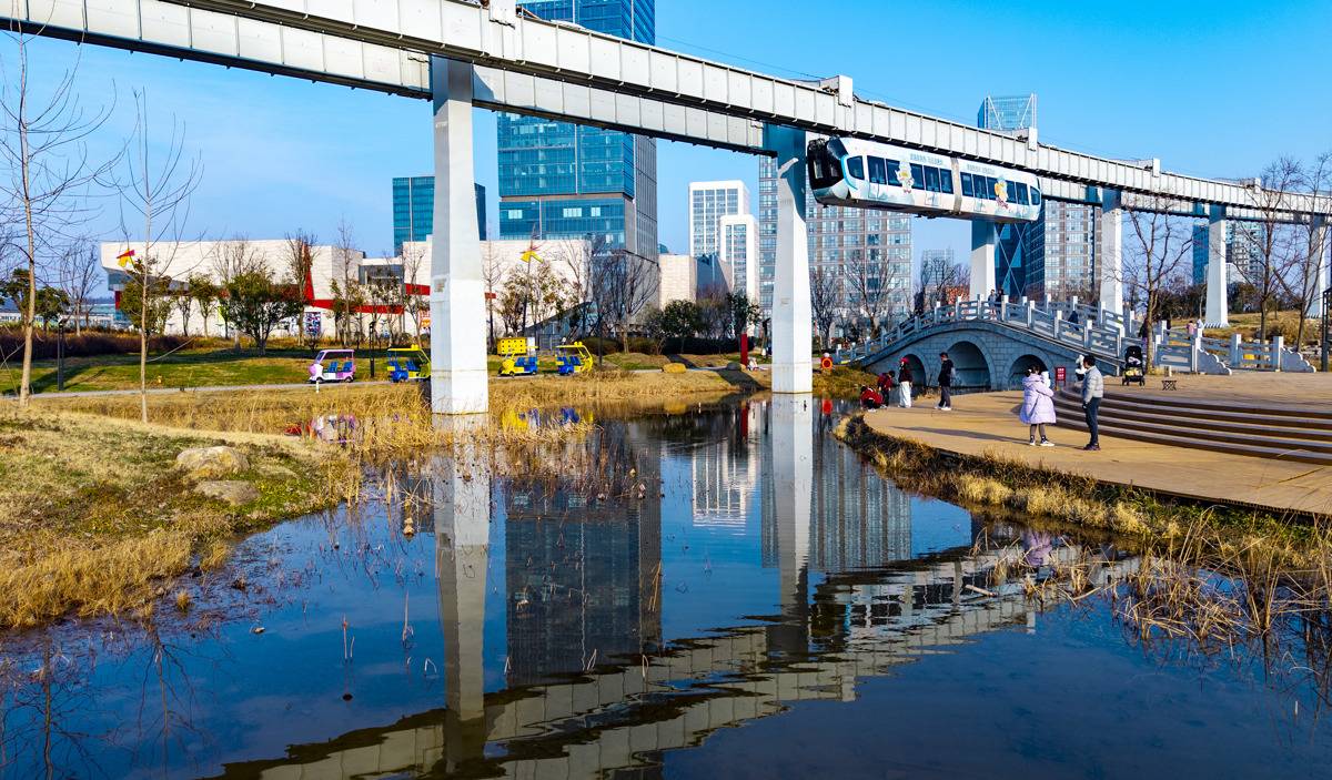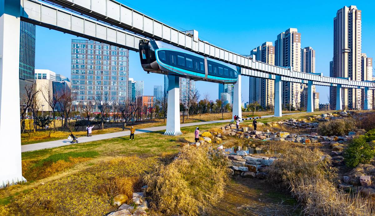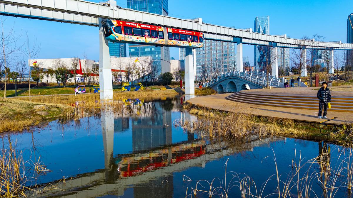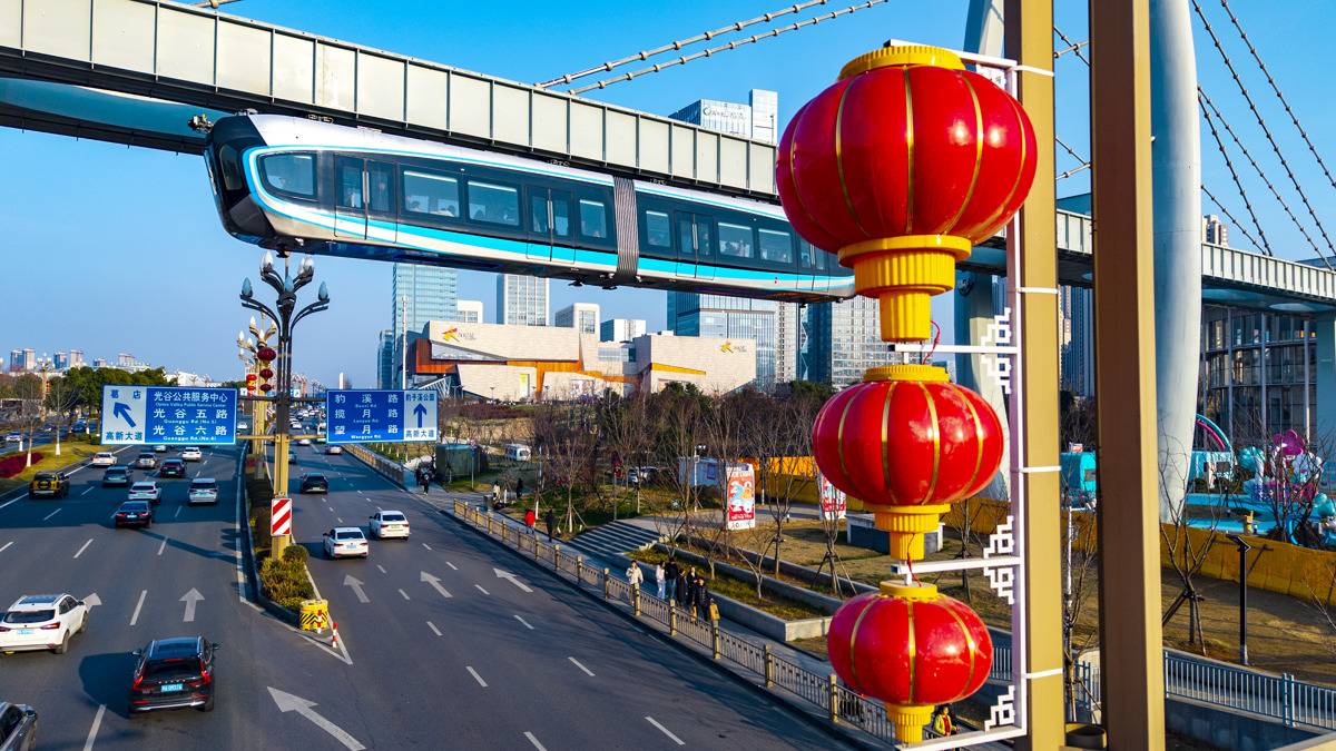2月8日,“光谷光子号”空轨载着全国各地游客飞驰在光谷中央生态大走廊。