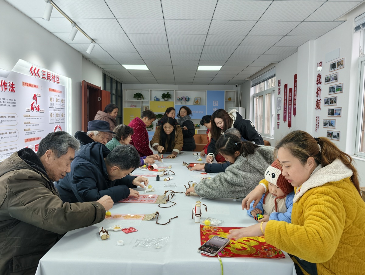 参与居民涵盖不同年龄段,现场交流印制技巧。年长居民还向青少年介绍了当地围垦历史上的春节习俗。活动在实践体验中融入民俗传承,提升了居民对本土文化的了解。