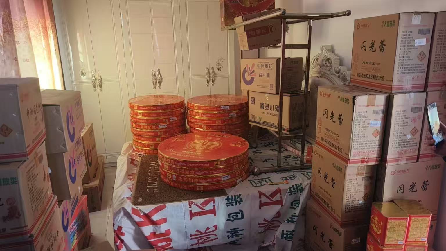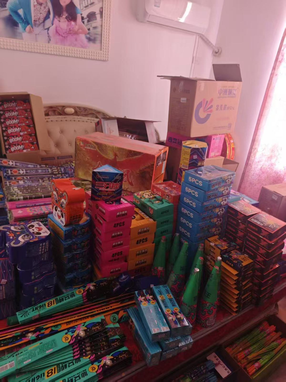 在祭祀用品批发店,民警当场控制正在整理接单记录的张某红。与此同时,另一组民警火速赶到三店街某村湾的老屋,打开房门时,只见屋内堆满了密密麻麻的纸箱,全是各类烟花爆竹,空气中弥漫着淡淡的火药味。此时,张某辉正蹲在地上整理货物。