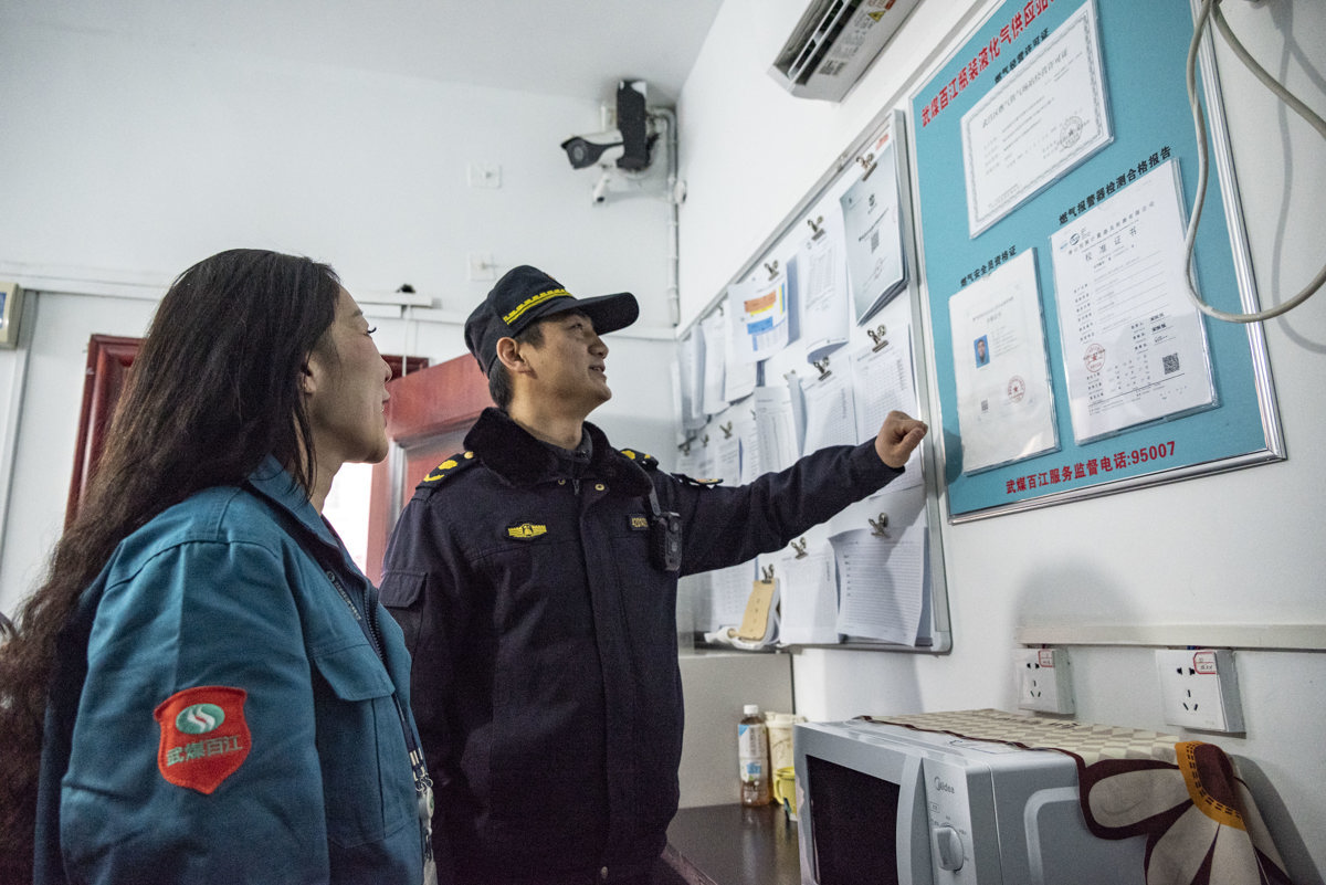 在武煤百江武船燃气供应点,武昌区城管执法局检查人员实地查看站点气瓶存储区及安全设施配置,翻阅日常管理台账,了解气瓶储存数量、流转管理、隐患排查整治等情况,并要求站点一定做好春节期间应急值班、保供预案及安全措施落实。