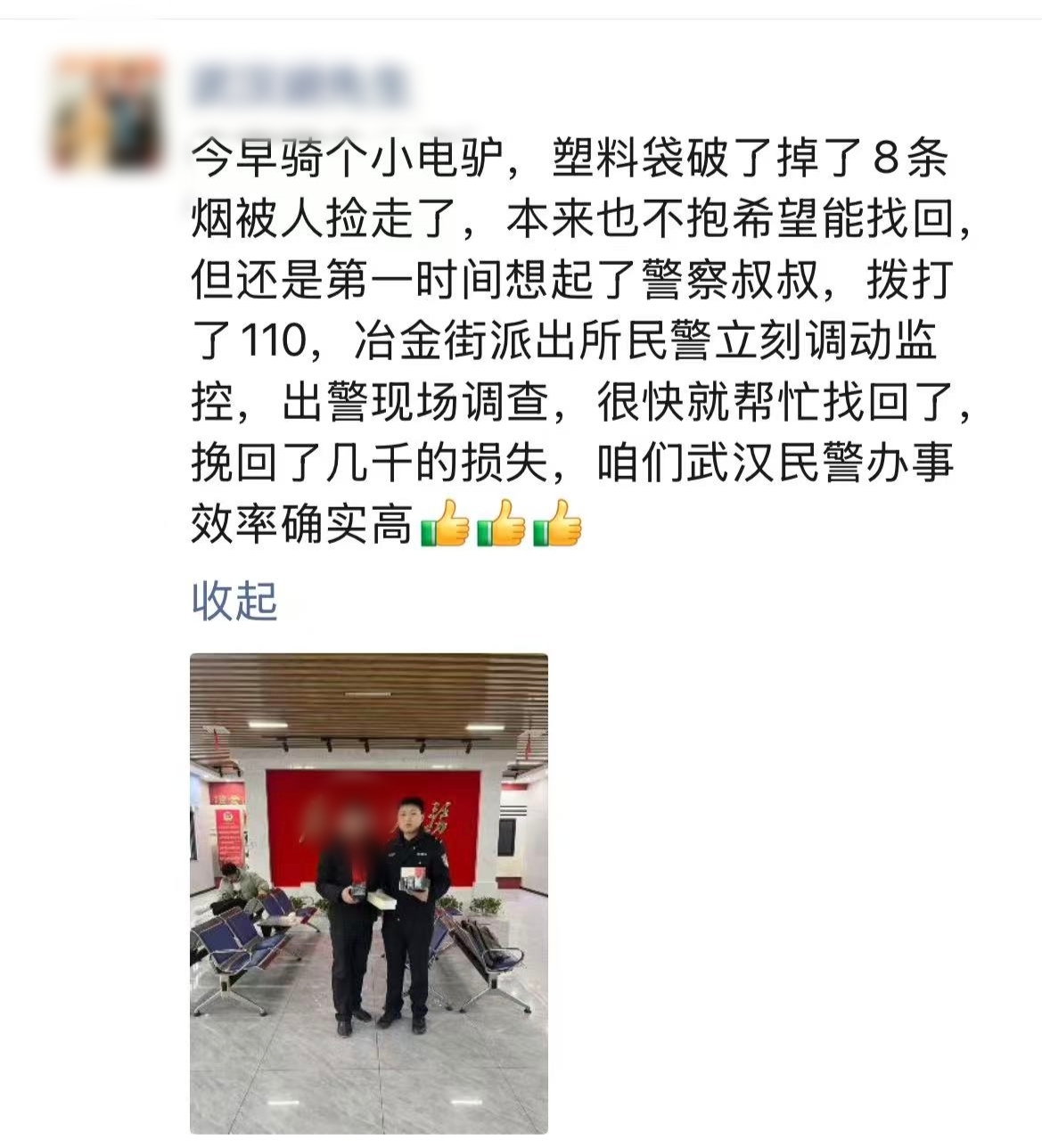 春节前,武汉青山一群众不慎遗失了价值3000余元的香烟,青山警方接警后迅速展开排查,仅用2小时便成功找回全部遗失物品并归还失主,收获失主点赞。
