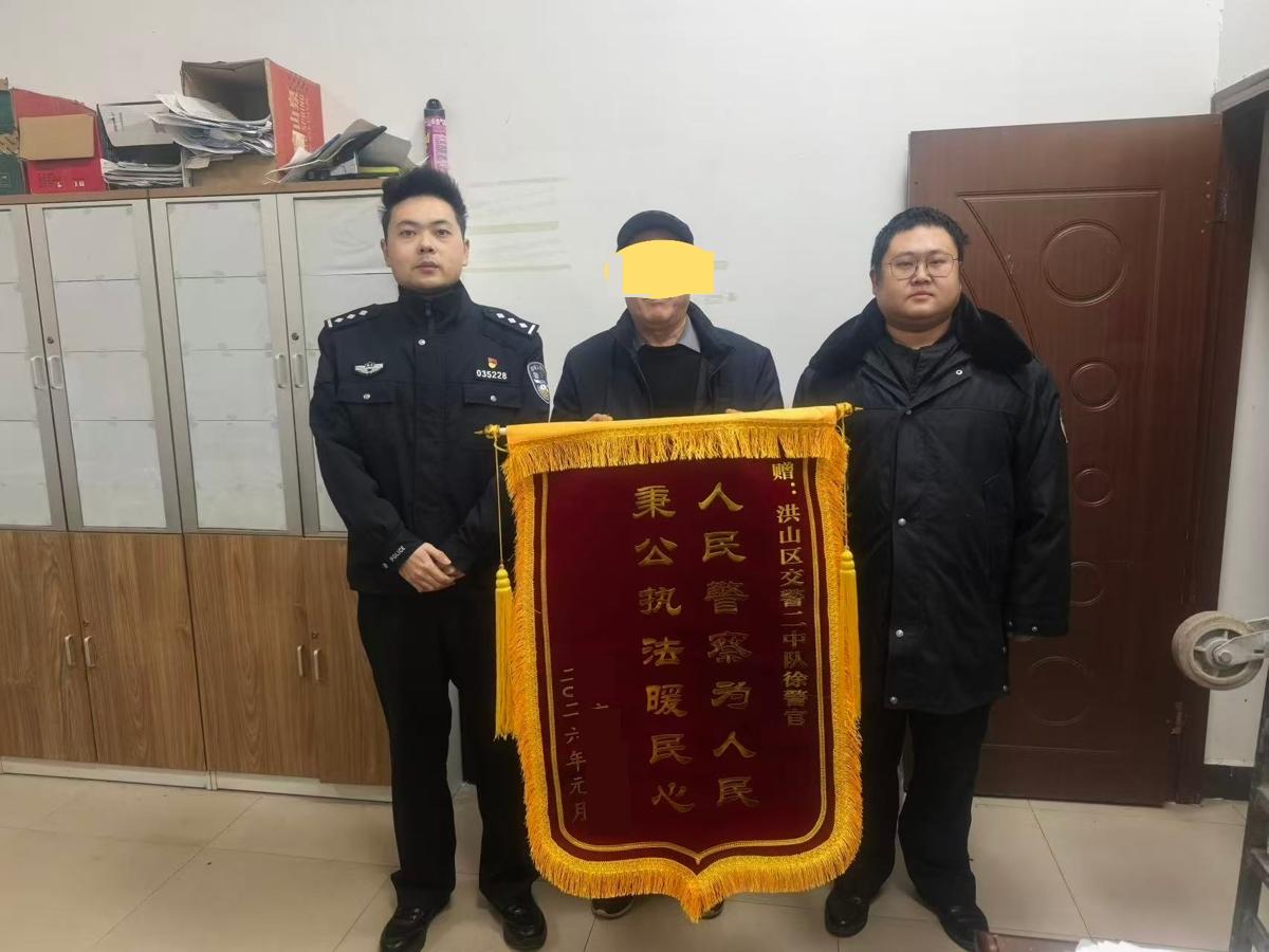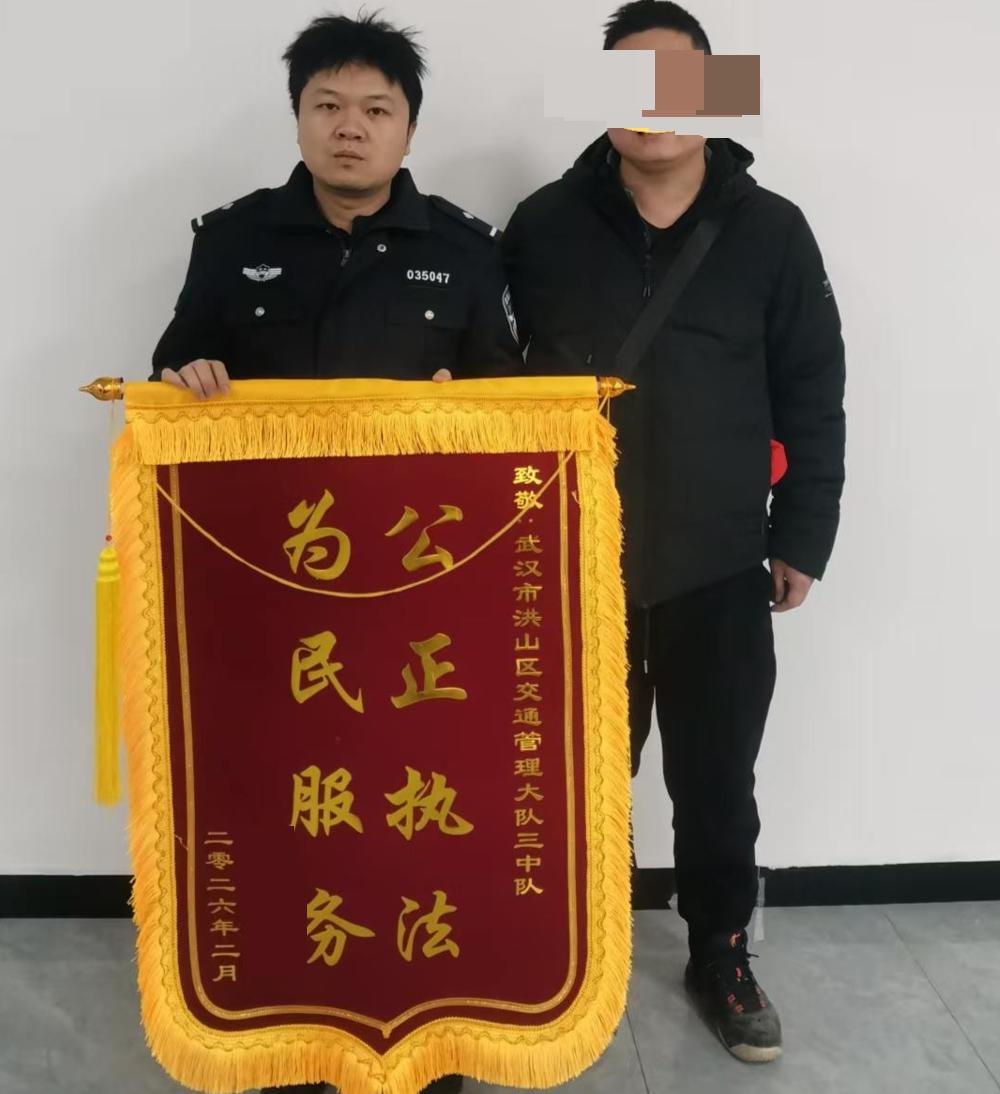 “公正执法 为民服务”,市民王女士将这面锦旗送到了洪山区交通管理大队三中队。2026年1月,王女士在一起电动车交通事故中受伤,而对方驶离了现场。由于现场视线受阻,调查存在困难。三中队办案民警邓攀接警后,不放过任何蛛丝马迹,通过反复勘查现场、调阅大量公共视频,历经数小时努力,最终成功找到了涉案方,妥善处理了事故,并及时安抚了王女士的情绪。王女士家属深受感动,特地送来锦旗致谢。