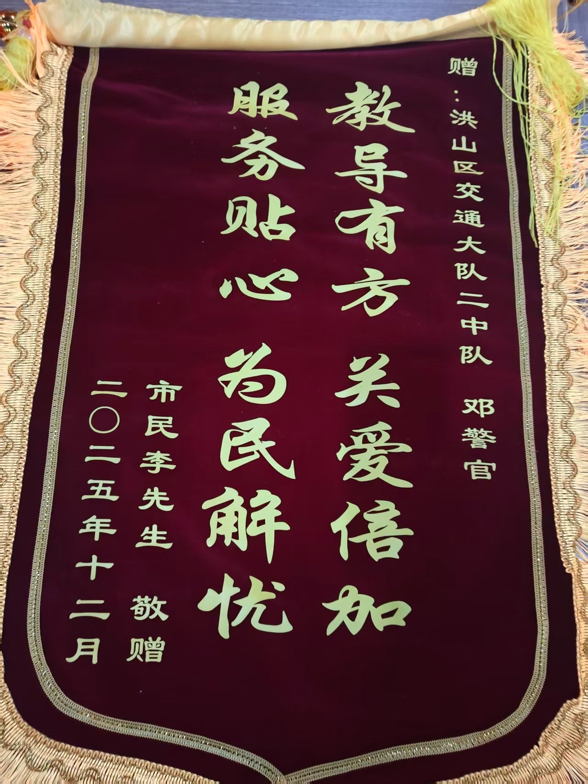 一面面锦旗,是肯定,更是鞭策。它们承载着人民群众对武汉交警工作的信任与期盼。洪山大队全体民警辅警将继续坚守“人民公安为人民”的初心使命,以更高标准、更实作风,全力保障辖区道路安全畅通,用心用情解决群众急难愁盼,不断提升交通管理服务水平,努力让人民群众在每一起案件处理、每一次执法服务中都能感受到公平正义与温暖。