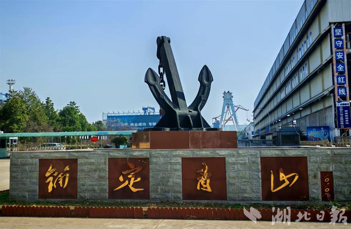 青山船厂大门口有一尊雕塑,上书“锚定青山”。(湖北日报全媒记者戴文辉摄)