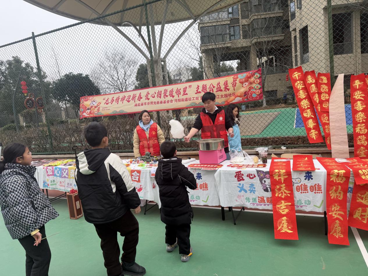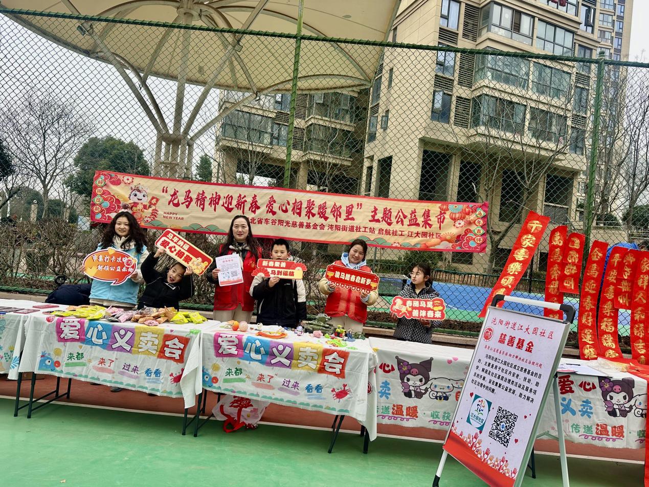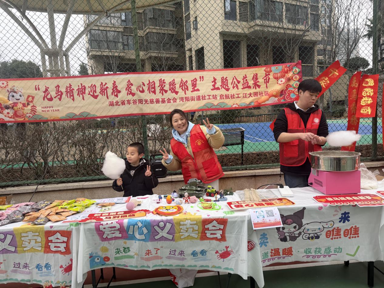 2月10日,在湖北省车谷阳光慈善基金会支持、经开区民政局指导下,由武汉市新洲区启航社会工作服务中心承办,沌阳街道社工站、江大园社区协办的“龙马精神迎新春爱心相聚暖邻里”主题公益集市,在联投金色港湾2期篮球场开展。本次活动以爱心义卖、民俗体验为载体,让社区居民在浓浓年味中传递公益温情。