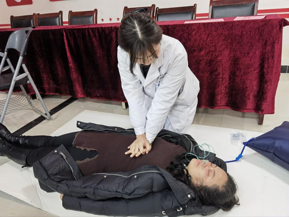 本次活动以知识普及与实战演练相结合。现场首先通过PPT演示形式开展安全专题培训,重点围绕家庭电气线路隐患排查、取暖设备规范使用、初期火灾处置及逃生技巧等核心知识点进行详细解读,用通俗易懂的语言讲解日常安全隐患排查要点,针对冬季高发的一氧化碳中毒问题,培训从中毒症状识别、现场急救原则到规范处置流程进行了系统讲解。随后,由志愿者配合卫生服务中心医护人员,现场模拟一氧化碳中毒急救场景,完整演示了人员转移、生命体征判断、心肺复苏等关键环节,进一步强化了参训人员的应急反应能力。