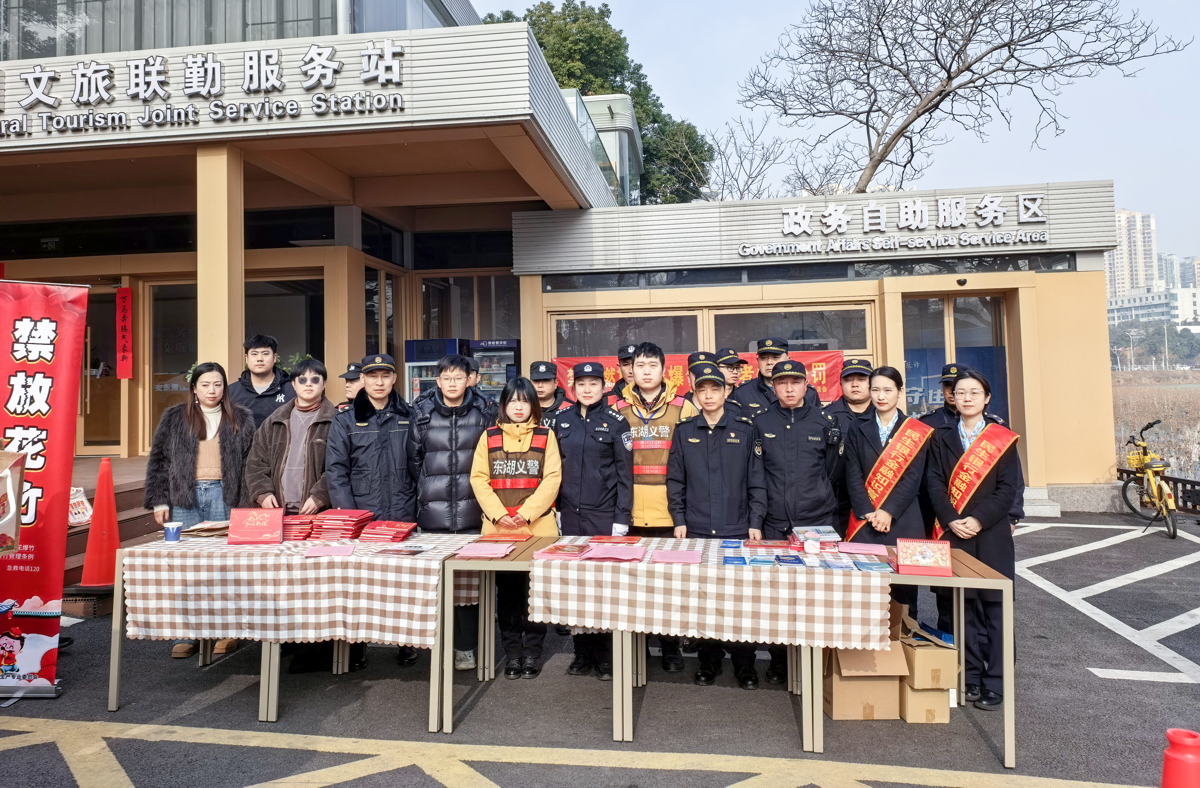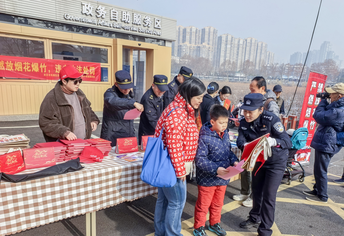 2月11日,南方小年。武汉东湖生态旅游风景区马鞍山森林公园的入口处,阳光斜斜地洒在摆满宣传册的长桌上。来自公安、城管、银行、东湖义警、文旅集团等多家单位的工作人员齐聚在这里,联合开展禁鞭集中宣传活动,用贴心提醒为市民游客送上一份特殊的小年“平安福”。