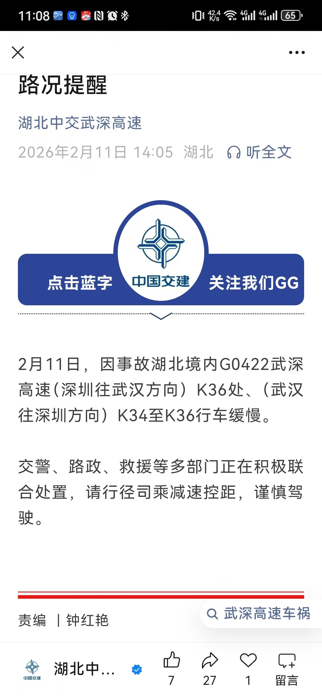 2月11日14:05,湖北中交武深高速有限公司微信公众号发布信息:2月11日,因事故湖北境内G0422武深高速(深圳往武汉方向)K36处、(武汉往深圳方向)K34至K36处行车缓慢。交警、路政、救援等多部门正在积极联合处置,请行经司乘减速控距,谨慎驾驶。