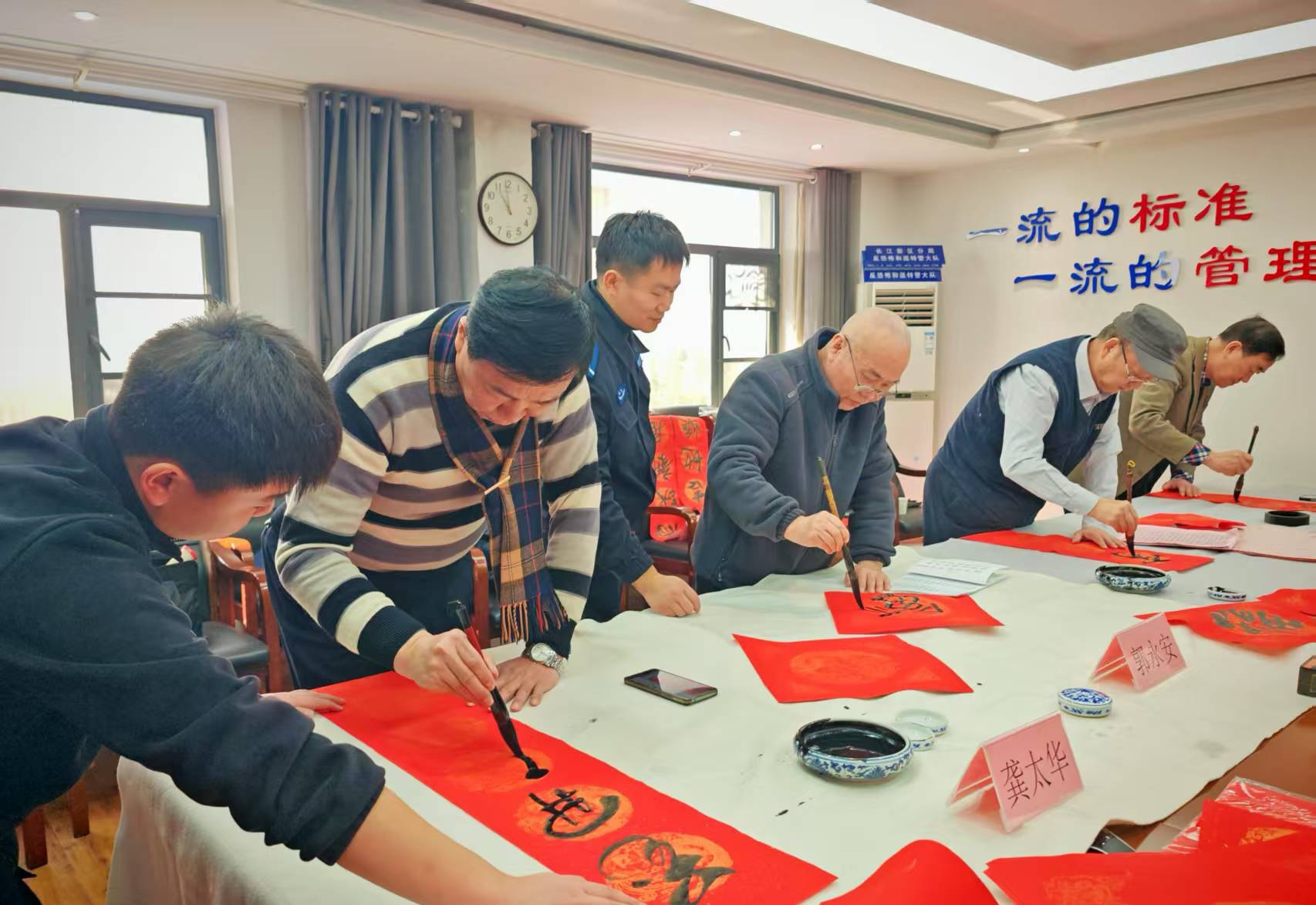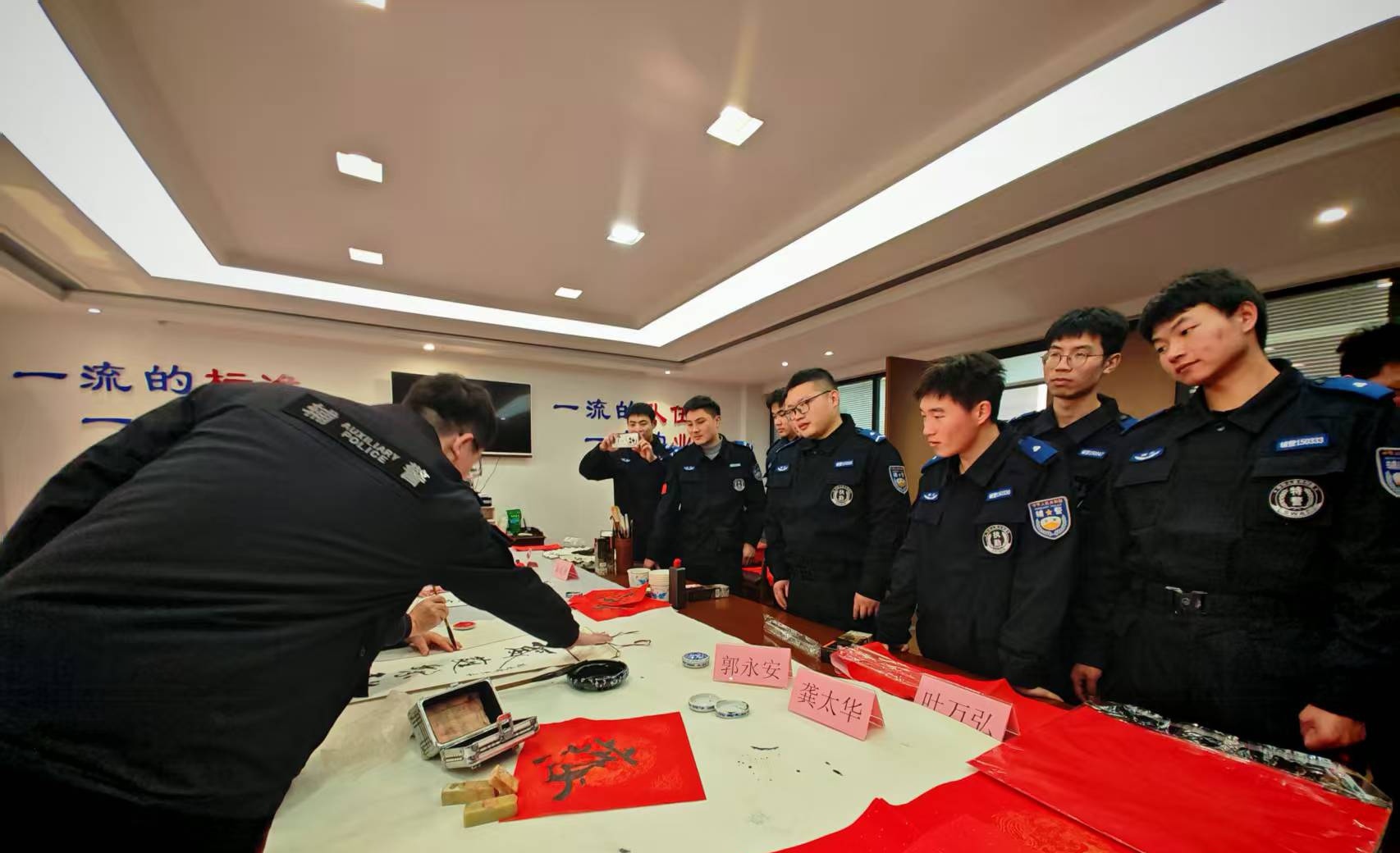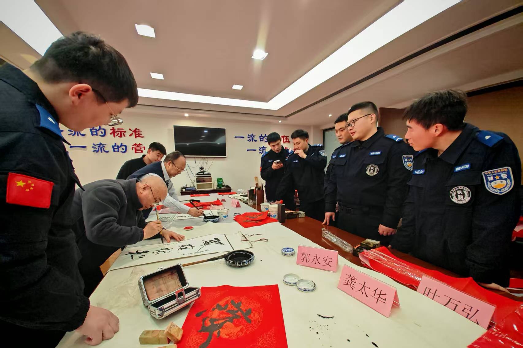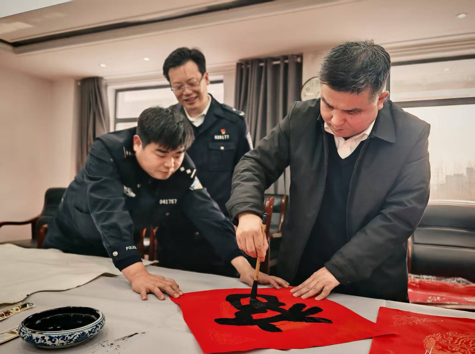 活动现场,翰墨飘香,气氛热烈。由湖北省公安厅国保总队原总队长方平安、省公安厅原副巡视员阚成琳、省公安厅督察总队原总队长龚太华、省公安厅交管局宣传中心原主任叶万弘、省书法家协会省直分会副会长兼秘书长郭永安等人组成的省直警营书法家小分队开展新春走基层文化暖警活动。在三楼视频会议室里,省直警营书法家们铺纸研墨,挥毫泼墨,将浓浓的祝福倾注于笔端。一笔一画,书写的是警民情深;一字一句,寄托的是美好祝愿。