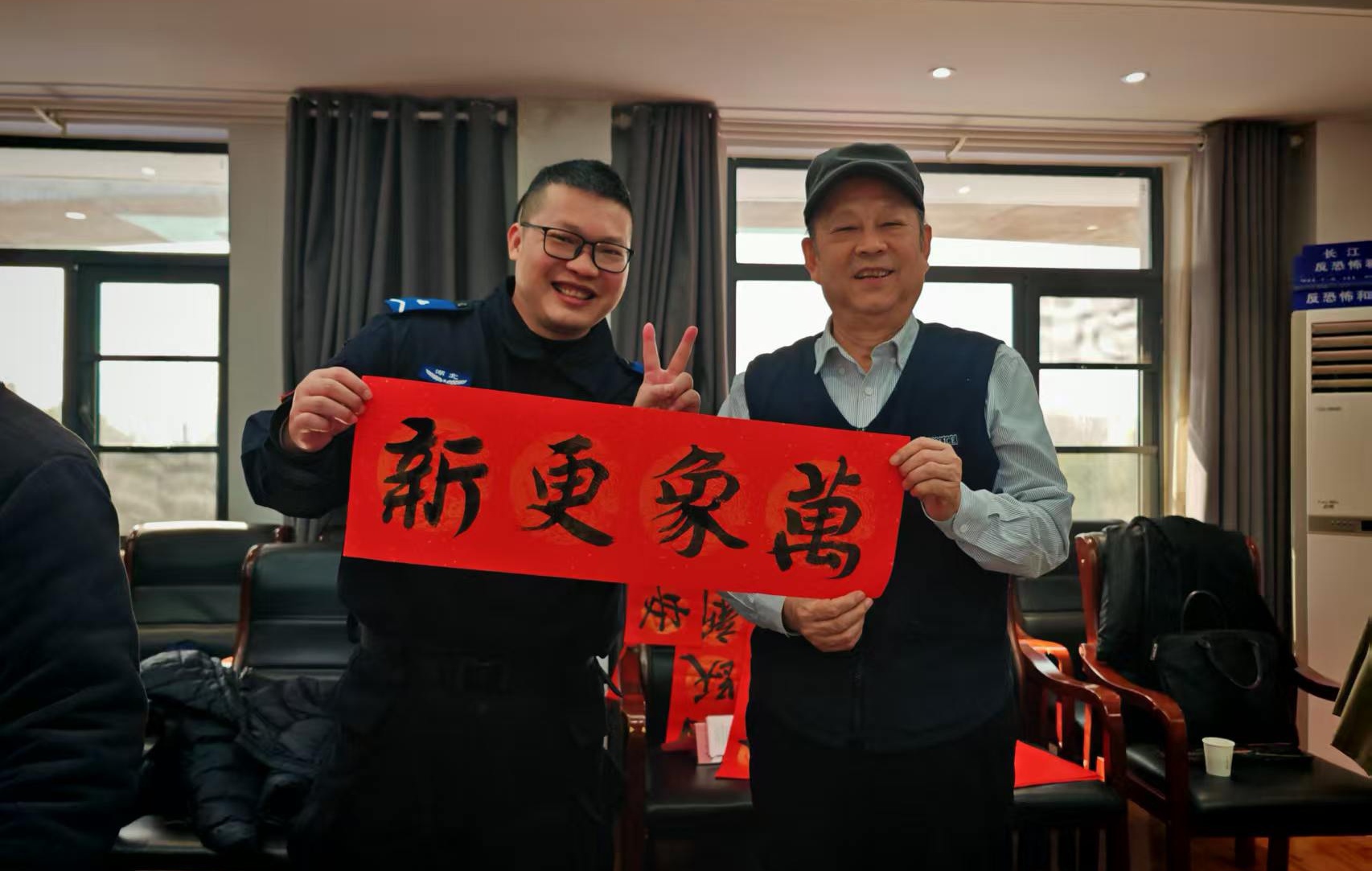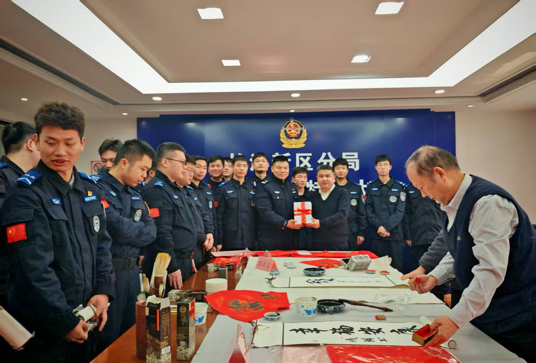 大队长胡建波表示,非常感谢省直警营书法家们能深入长江新区基层警队第一线,为全队民辅警开展写春联送福字活动,这不仅为警营增添了浓浓的年味,更是一次深刻的文化浸润和精神洗礼。全体队员将以更加饱满的热情、更加昂扬的斗志投入到春节安保工作中,为维护好长江新区社会稳定、保障人民安居乐业贡献特警力量。