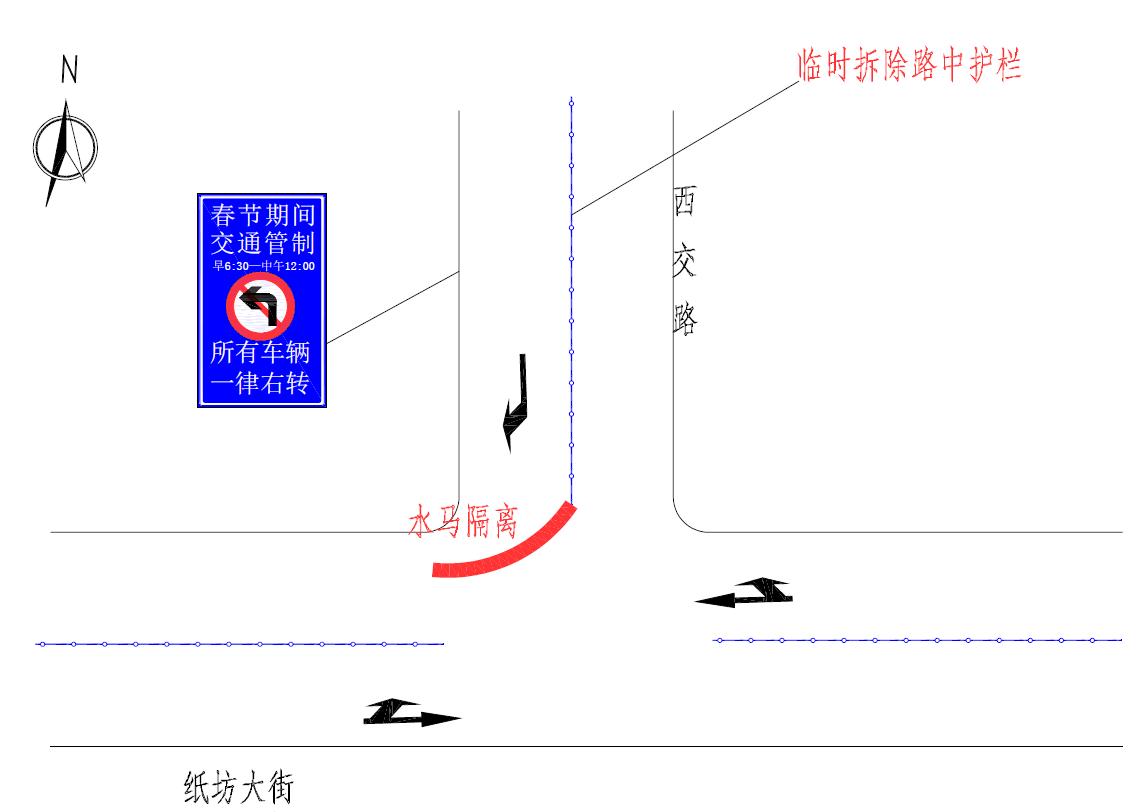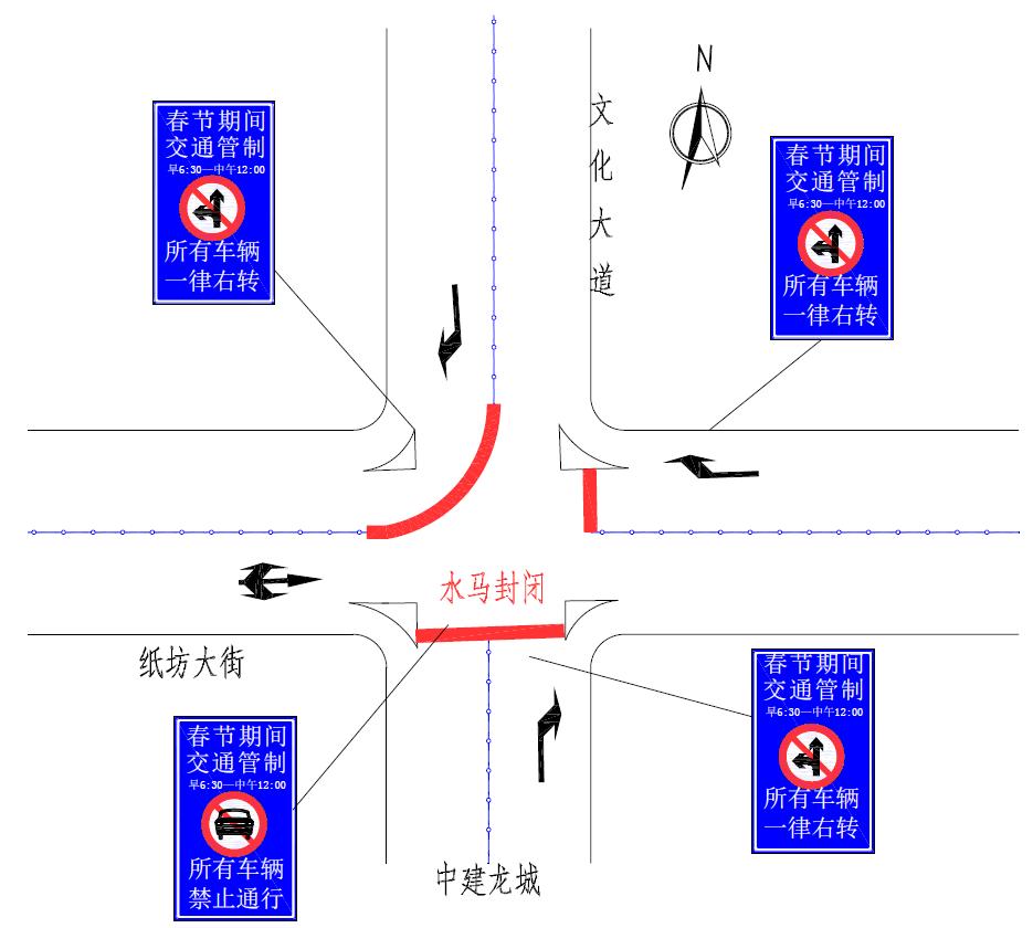 (5)纸坊大街与文化大道路口:由南向北方向的机动车一律右转,由东向西方向的机动车一律右转,由北向南方向的机动车一律右转。