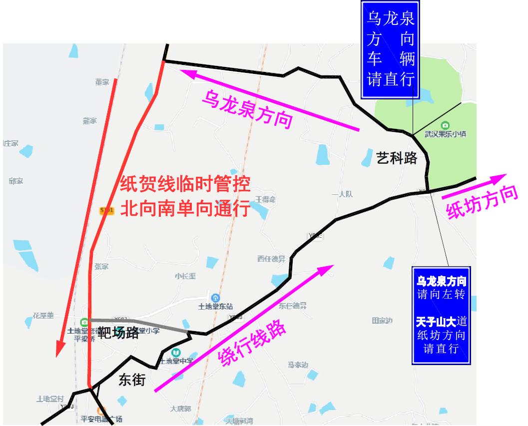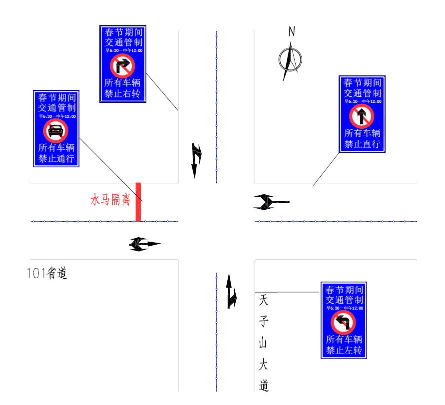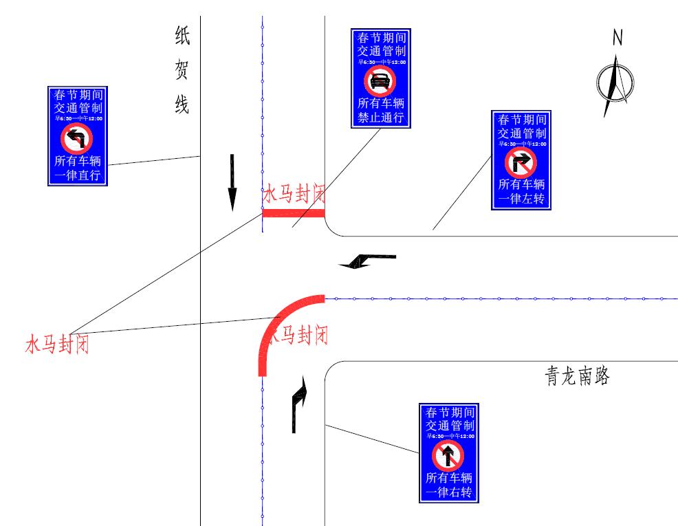纸贺线与青龙南路路口:由南向北禁止机动车直行,由东向西禁止机动车右转,由北向南禁止机动车左转,进城车辆可通过纸陈线、天子山大道绕行。