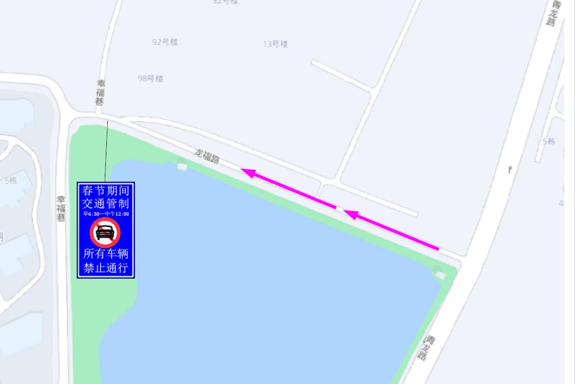 龙福路(青龙路至幸福巷):实行机动车由东向西单向通行。