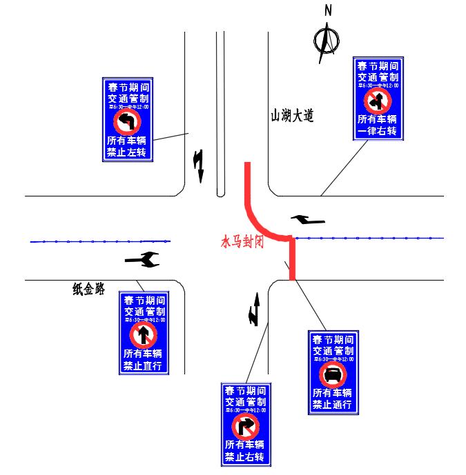 山湖大道与纸金路路口:由南向北禁止机动车右转,由西向东禁止机动车直行,由北向南禁止机动车左转,由东向西方向的机动车一律右转。