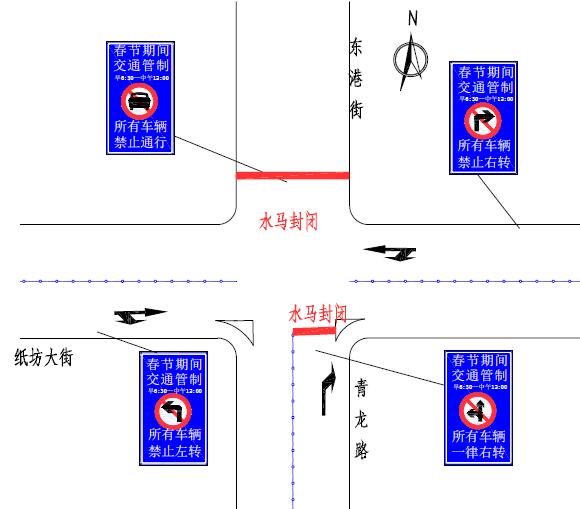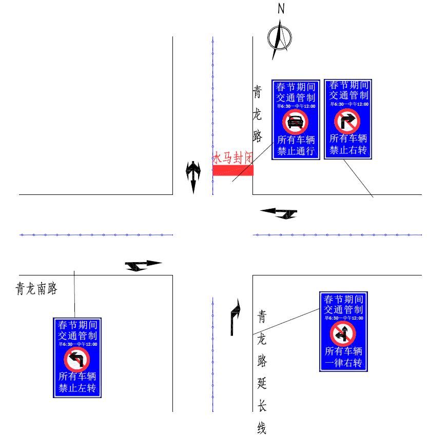 青龙路与青龙南街路口:由南向北方向的机动车一律右转,由西向东禁止机动车左转,由东向西禁止机动车右转。