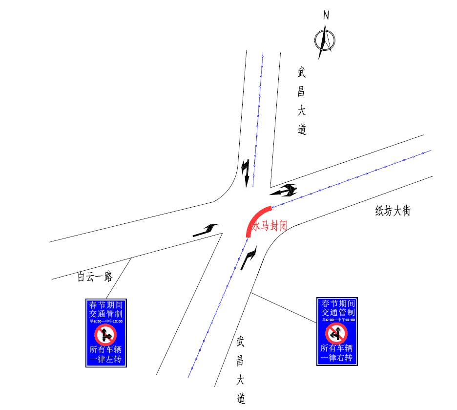 纸坊大街与武昌大道路口:由西向东方向的机动车一律左转,由南向北方向的机动车一律右转,由北向南禁止机动车左转。