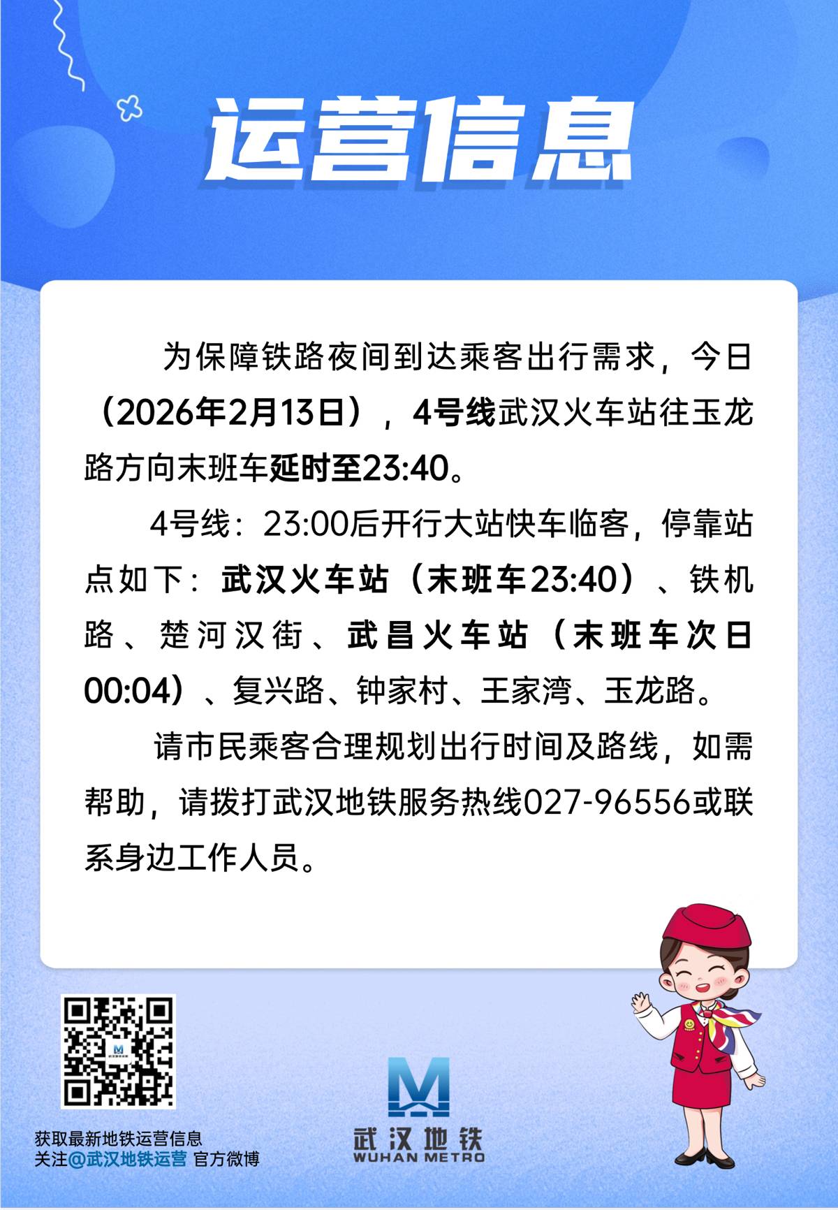 为保障铁路夜间到达乘客出行需求,今日(2月13日),4号线武汉火车站往玉龙路方向末班车延时至23:40,停靠站点如下:武汉火车站(末班车23:40)、铁机路、楚河汉街、武昌火车站(末班车次日00:04)、复兴路、钟家村、王家湾、玉龙路。