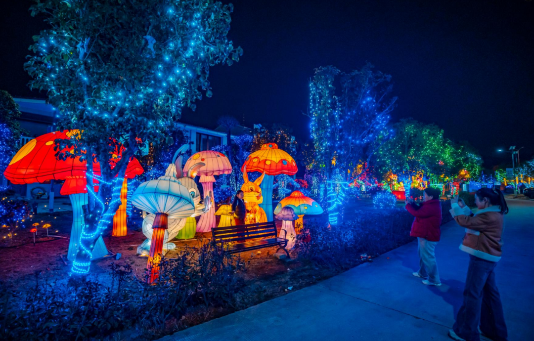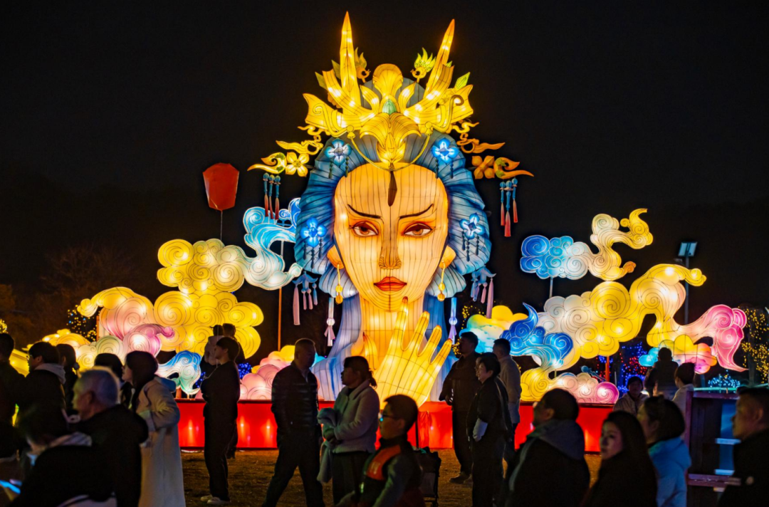 虫鸟花灯园里,一位小朋友蹲在蝴蝶灯下不肯走,妈妈笑着说:“他从进门就喊着看漂亮灯,今天总算过瘾了。”舞台区旁边,簪花女神花灯正低眉浅笑,注视着游客。