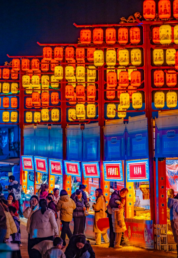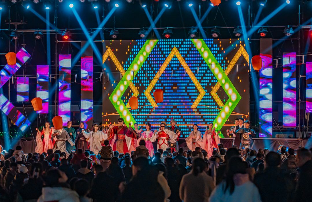 广场中央的舞台前围得水泄不通,身着古装的演员长袖翩跹,不时与台下观众互动。猜灯谜、投壶的摊位前排起长龙,穿甲胄的“将军”为游客递上箭支,一袭汉服的“仙子”轻摇团扇提示谜底。