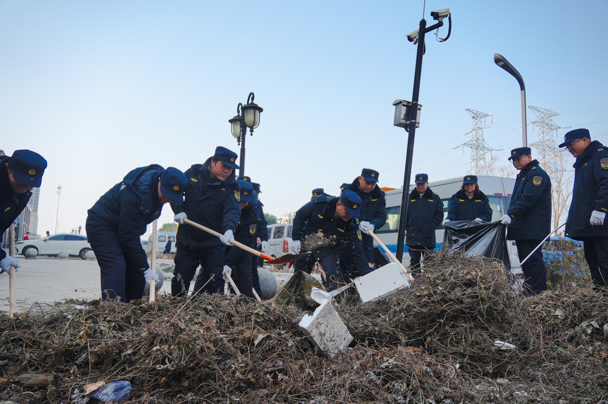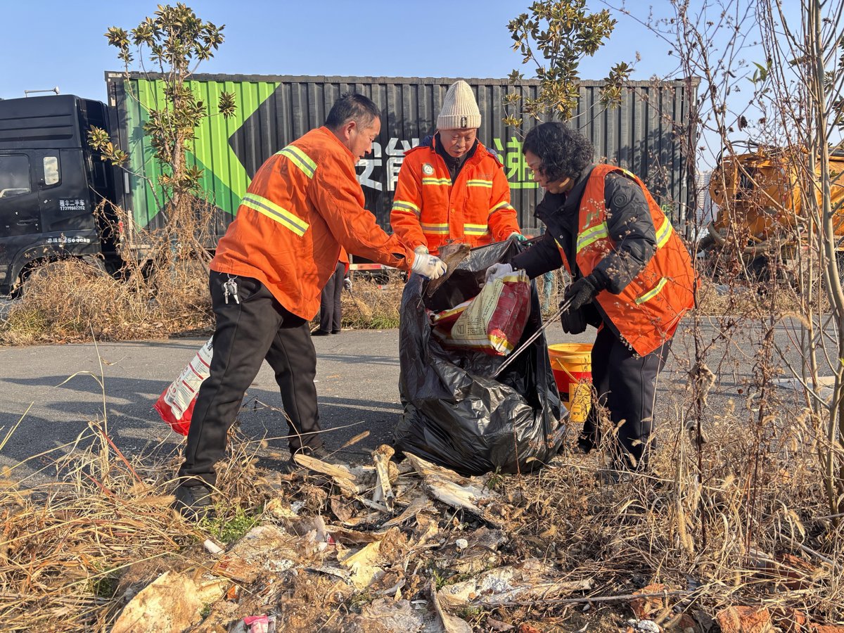 清理现场,“环卫橙”6人一组,着力攻坚凌云路最西端的围墙角落,对着堆积的装修垃圾下手,扫帚扫、铁锹铲、徒手搬,装袋、转运,一气呵成。东西区城管执法局和径河街的“执法蓝”队员们则紧盯桥头两侧的闲置地块,枯草藤蔓缠成一片,队员们挥镰刀、抡铁锹,把杂草连根清掉,草丛里露出的塑料袋、泡沫盒,一个个弯腰捡干净。“园林绿”师傅们手持高枝剪,沿着绿化带,麻利地修剪枯枝野草,咔嚓几声,枝叶落地的同时,绿化带也清爽了不少。