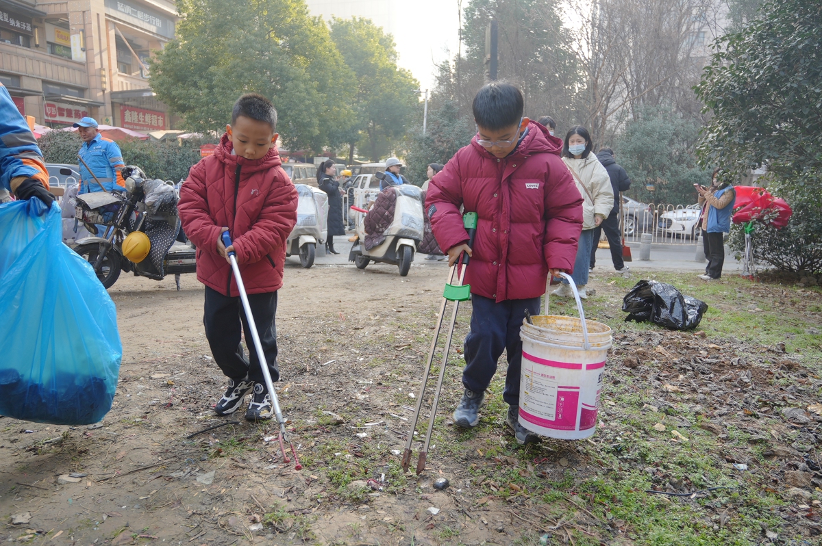 “我们跟着爸爸妈妈来参加清洁家园活动,也想贡献一份力量。”两名小学生手持长夹,认真地捡拾着园内的垃圾,“爸爸妈妈都是志愿者,利用寒假时间跟着他们一起,开展社会实践活动,很有意义。”两名小朋友开心地说道。