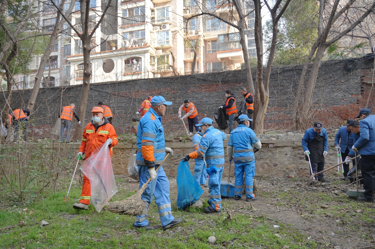 在安胜路凯德1818旁的小游园里,一支由环卫工人、姚家岭社区工作者、物业工作人员、市场化公司人员及志愿者共计60余人组成的志愿清洁队伍正忙碌不停。大家分工明确、协同合作,有的挥动铁锹清理枯枝断叶,有的蹲下身子擦拭休闲座椅,有的捡拾地上的垃圾,小游园里到处都是他们忙碌的身影。