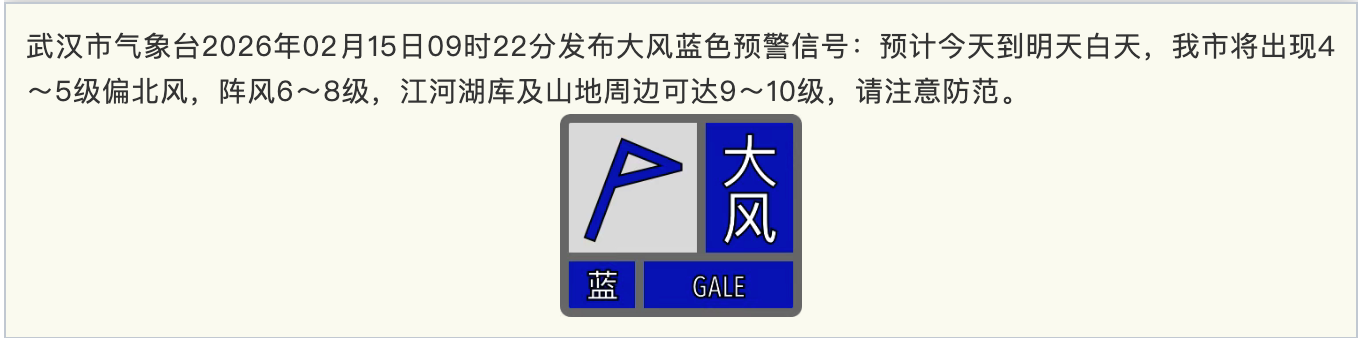湖北日报讯(记者汤炜玮、通讯员高琪清)2026年春节假期正式开启今早的武汉天空多云,阳光短暂现身,给腊月二十八的江城带来一丝暖意,然而好天气即将转换,雨水已在途中寒潮大风和降水马上就到!2月15日,武汉市多云转中雨,局地大雨并伴有雷电,偏北风2到3级转4到5级、阵风6到8级,江河湖库及山地周边9~10级,气温4~17℃。空气污染扩散气象条件预报等级为2级(较好)。