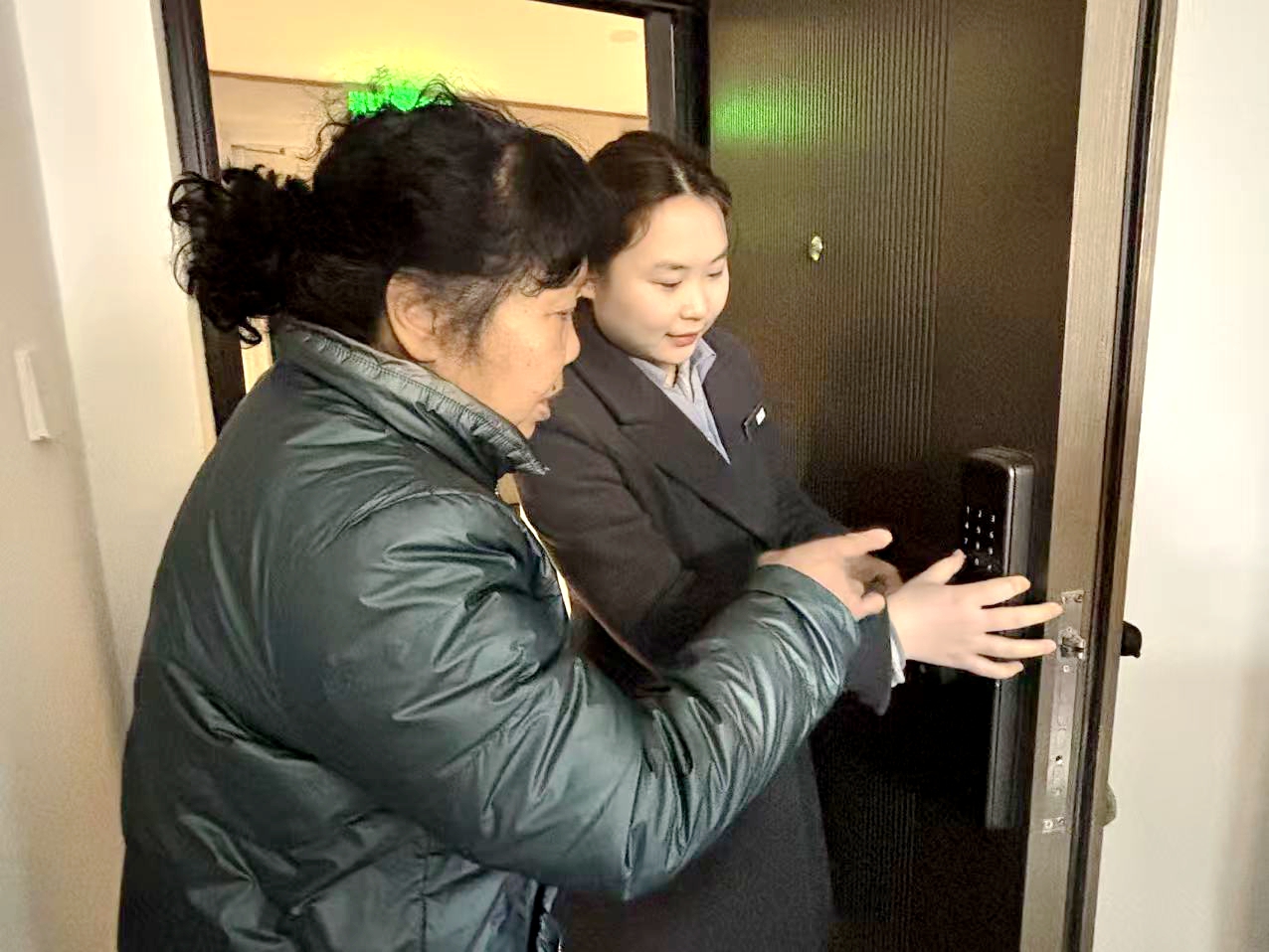 与记者畅谈间,小区龙湖物业工作人员谢丹提着新年大礼包走进家门,一句“阿姨新年快乐,我来给您送对联、录指纹”,瞬间让乔迁的喜悦更添几分暖意。她熟练地帮蔡国珍在入户门上录入指纹,细致讲解解锁操作,贴心的服务,让这个崭新的家更具温情。