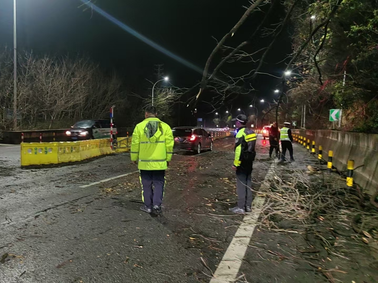 21时50分,四中队政治指导员夏添带领快骑队员巡逻至104省道玉笋山陵园路段,发现护林坡上多处树木被大风折断,占据大半个车道。队员们徒手拖拽清理,迅速打通通道。22时30分,夏添一行巡逻至汉蔡高速蔡甸收费站路口,发现准备用于应急分流的隔离水马被吹散在路中央。夏添安排队员殷齐在前方指挥车辆绕行,自己与其他人合力将笨重水马一一拖拽至路边,十多分钟后道路恢复畅通。