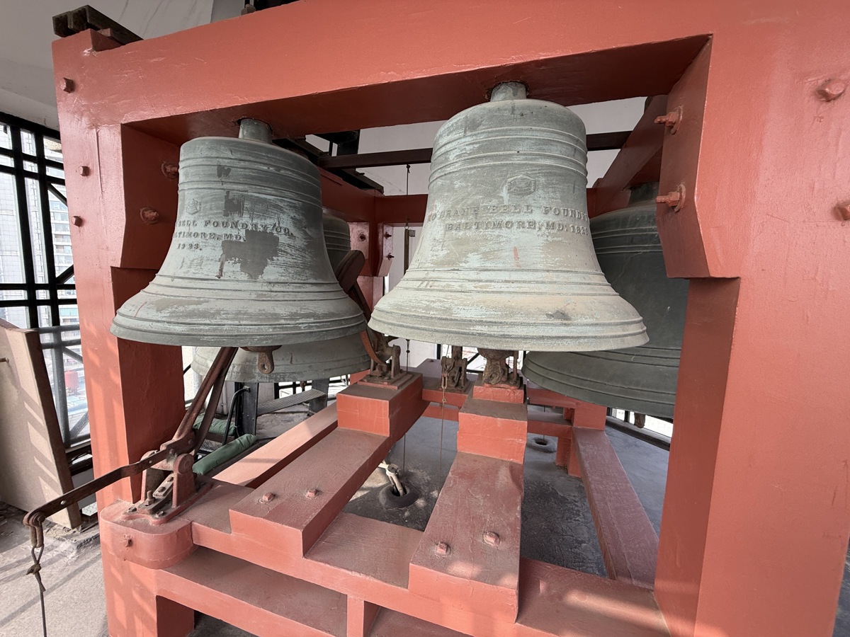 站在顶楼,记者看到了原始铜钟——五口大小不一的铜钟静静悬挂。据介绍,报时奏响的是《威斯敏斯特曲》,正好4个音节对应四口钟,另外一口钟用来报时。从前老人口中“在汉口敲钟,江对面都能听到”,在那个没有高楼、车马稀少的年代,钟声确实能传得很远很远。现在人们听到的电子钟声,是经过专业人士修饰音色后的声音,更加浑厚悠扬。
