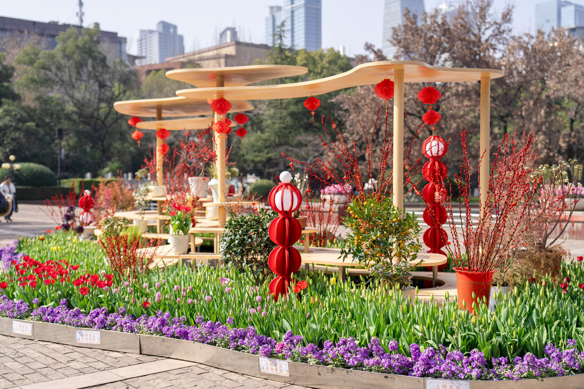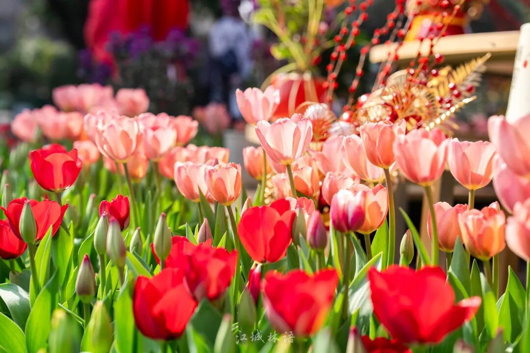 除郁金香外,还搭配风信子、雪柳、银柳、瑞香、北美冬青、结香、茶花、菊树、银合欢等20多个年宵花品种,节庆花境,其乐融融!