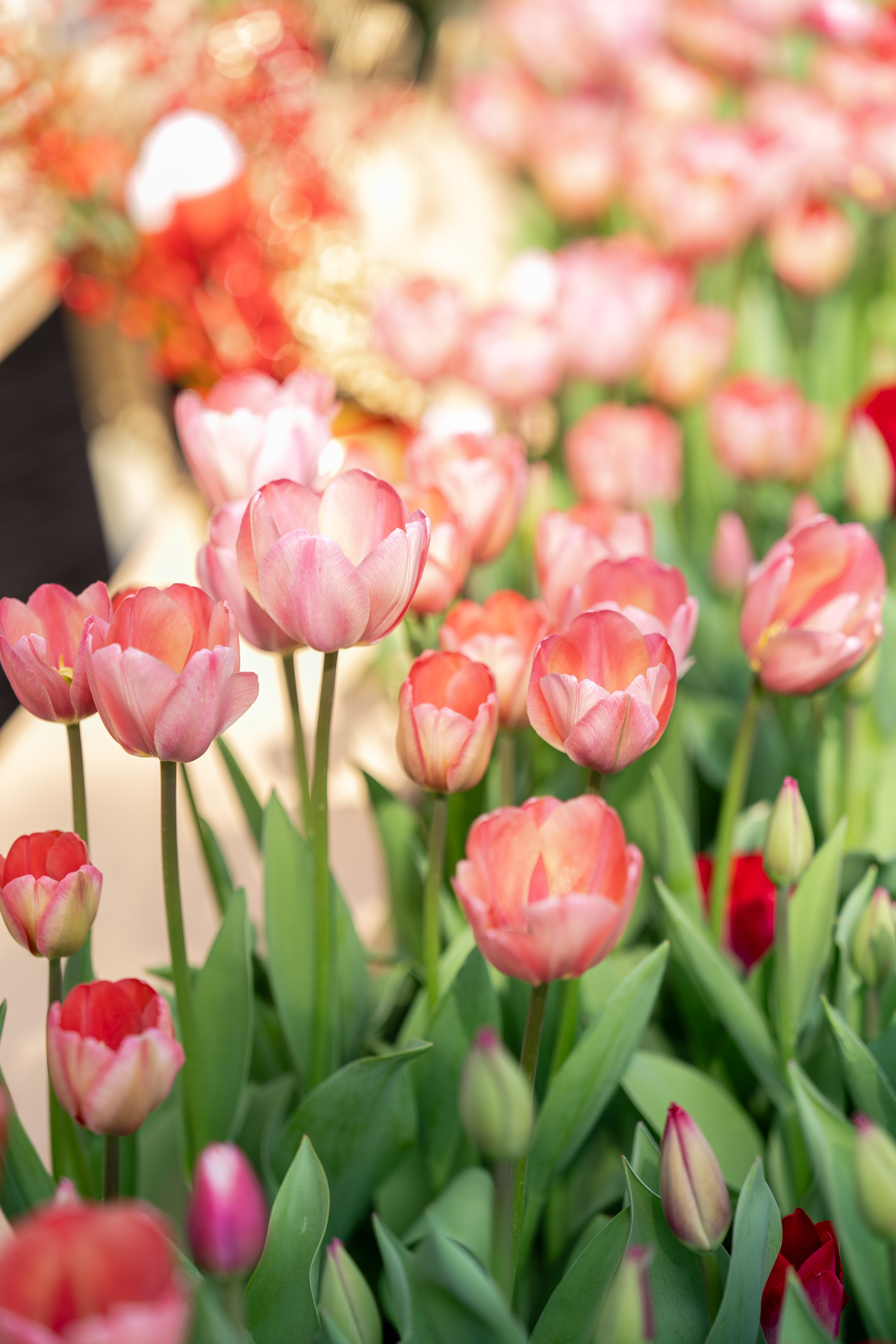 十余个品种郁金香集体亮相,整体视觉以粉色系为主,营造温暖柔和的春日基调。