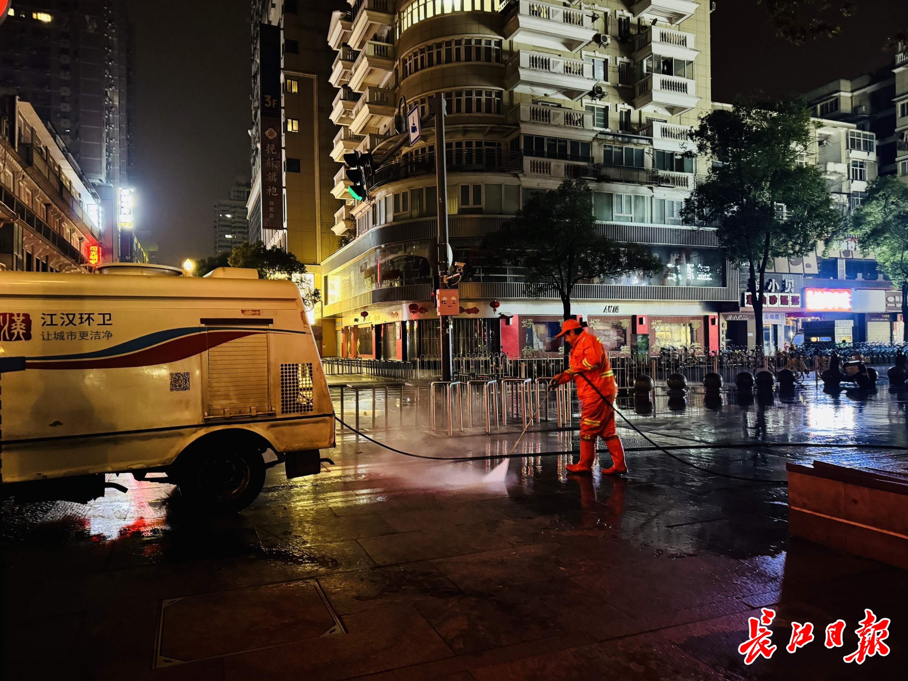 长江日报大武汉客户端2月17日讯(记者陶常宁 通讯员李军)大年初一凌晨4时许,当整座城市还沉浸在年味酣眠中,江汉路步行街已迎来最早的一批劳动者。路灯下,数名环卫工人的橙色身影格外醒目,他们正逐段清扫、冲洗路面,为即将到来的春节客流提前擦亮城市窗口。