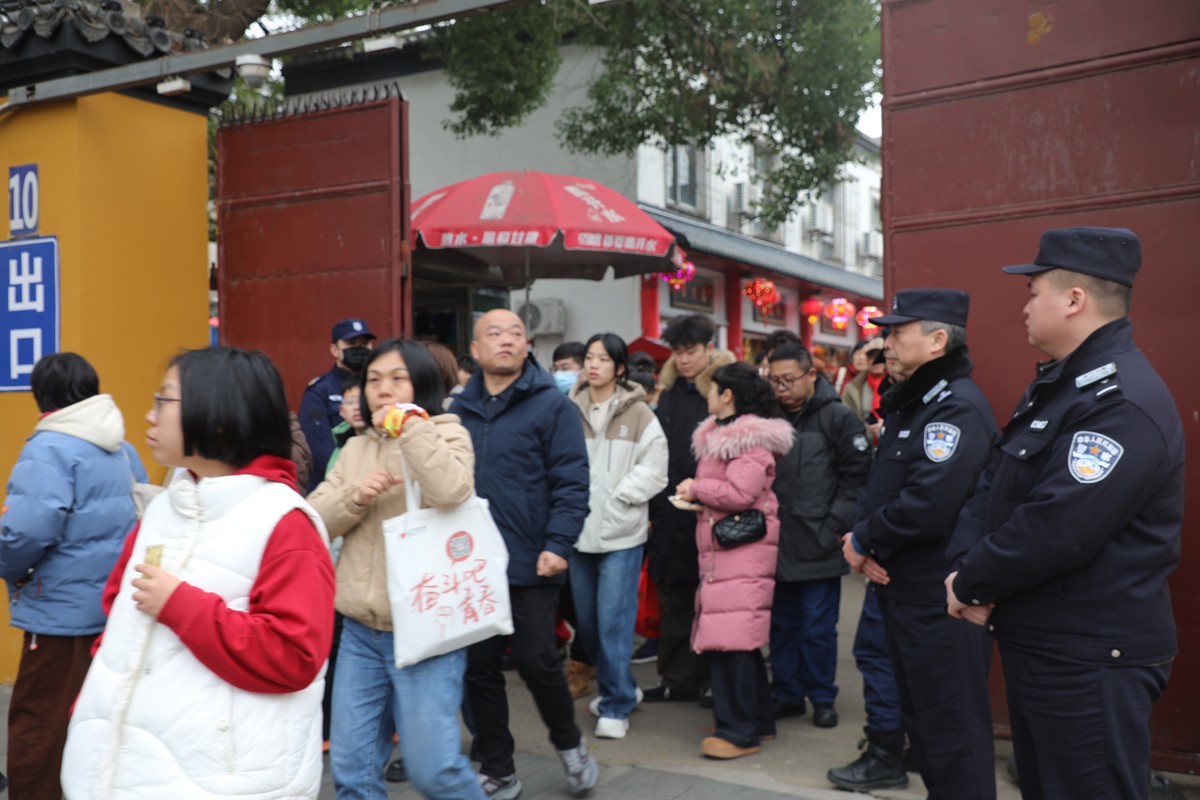 “我们在现场重点加强宣传提示和客流疏导,确保群众安全有序进场。”上午10时,归元禅寺入口处一排起长队,江堤街派出所民警朱峻彤和同事不时提醒大家:“留意脚下,拿好自身物品,注意安全。”