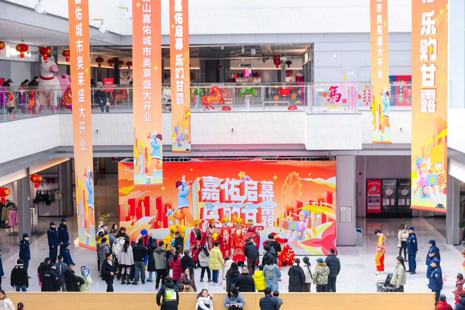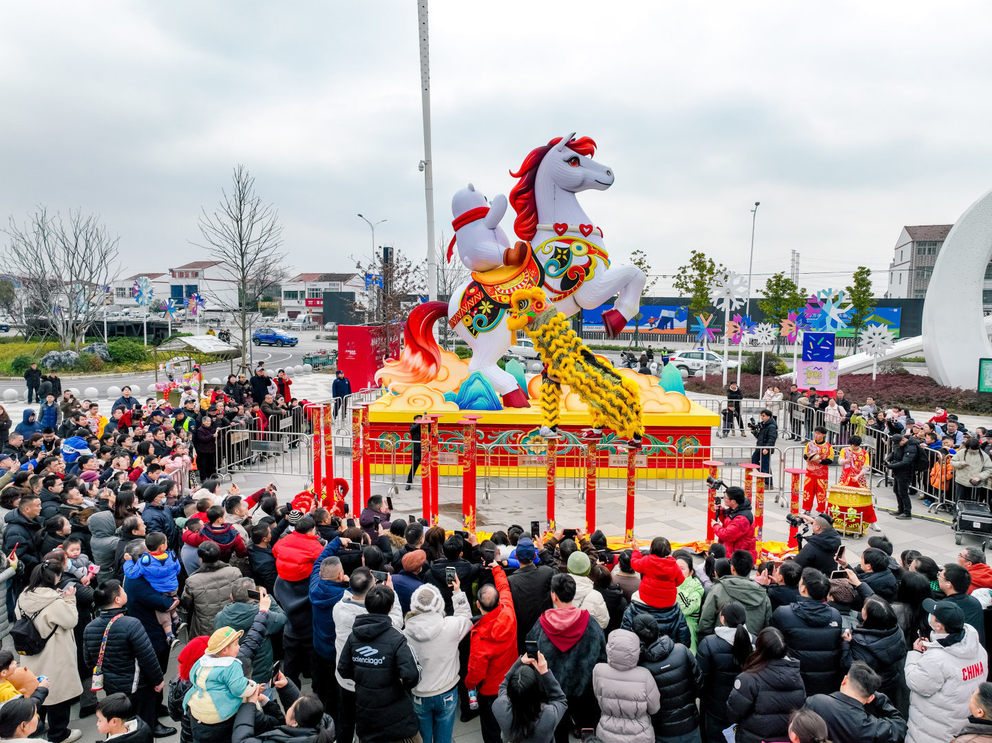 “快看,这里有条巨龙!”入口前广场上,一条巨龙腾空而起,全身由大小不等的红金气球扎成,威武中透着几分“萌”态。随着欢快的音乐声响起,由潮流花车与国风演艺人员组成的巡游队伍浩浩荡荡地出发,宛如一条流动的彩带。身着华美汉服的“才子佳人”沿街派发装着糖果和彩票的“福袋”,游客们纷纷伸手接福,笑声不断。高达近10米的巨型“马上发财”雪乐宝俏皮地立在园区入口,向每一位游客拱手拜年,引得孩子们争相合影。