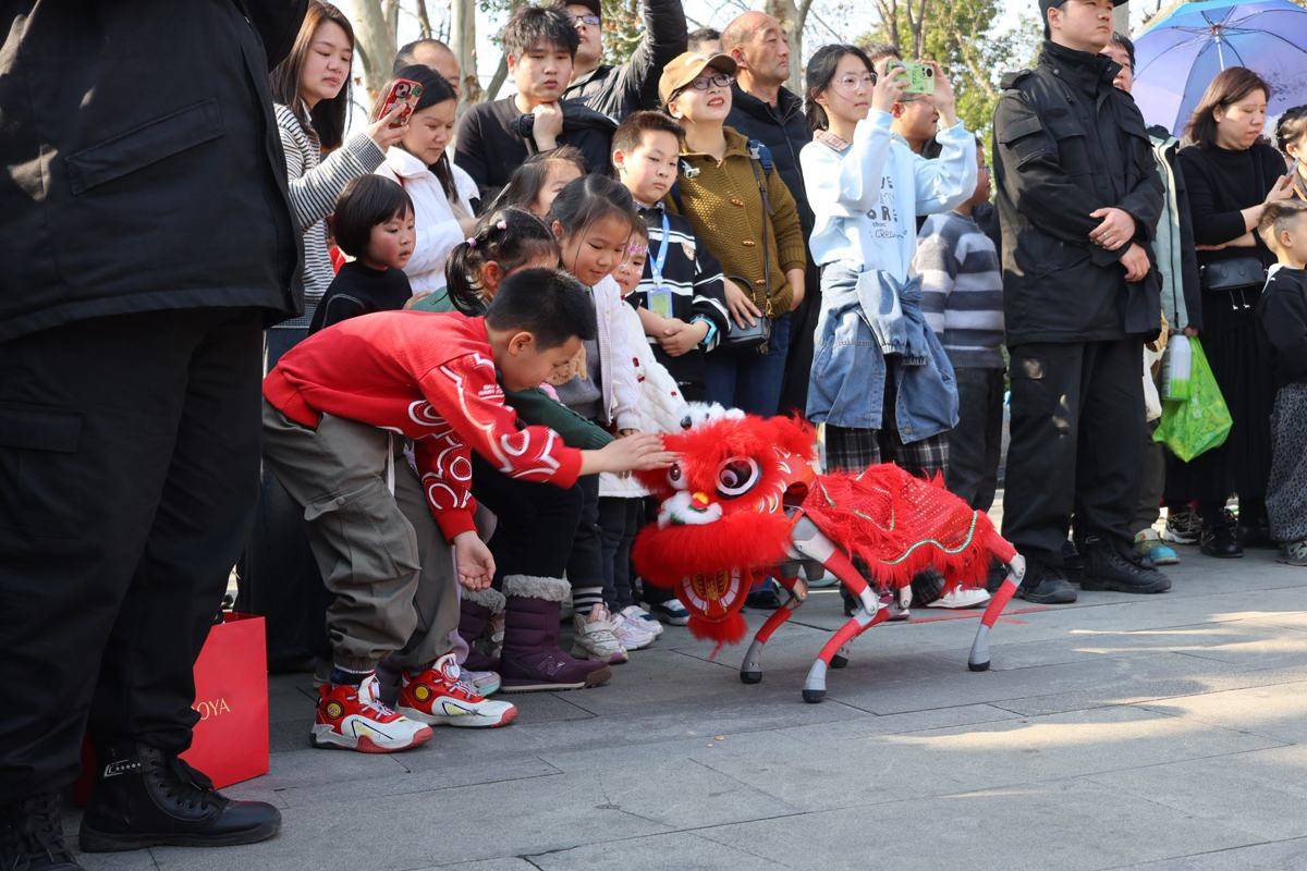 科技赋能民俗,成为今年东湖绿道新春最吸睛的亮点。大年初一上午,湖光序曲广场上锣鼓喧天、人声鼎沸,一场精心编排的传统舞龙舞狮表演准时开演。金色长龙在队员们的默契配合下,时而盘旋昂首、气势恢宏,时而穿腾翻滚、灵动自如;紧随其后的醒狮眨动着灵秀大眼,或俏皮探首与游客互动。而两只身披迷你醒狮装扮的仿生机器狗的惊艳亮相,更让这场传统表演焕发新生。精准跟随鼓点节奏,灵活完成行进、转向等动作,与龙狮队伍精妙配合,金龙盘旋时穿插其间,机器狗“醒狮”腾跃时同步跃起,妙趣十足。东湖绿道梅花宝宝“园园”穿梭在队伍与人群中,与机器狗、游客击掌合影、作揖拜年,引得阵阵欢笑与掌声,来自广东的游客王先生直言:“既有传统年味,又有科技新意,太惊喜,大年初一在东湖打卡太值了!”
