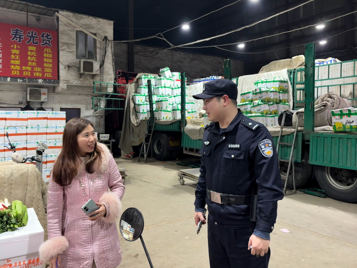 这样触手可及的守护从未因夜色而中断。2月14日晚上11时,搬运工刘师傅下班后找不到电动车,向警务室求助。此处没有监控,民警谭浩民顶着寒风,在大市场车流、巷道中穿梭排查半个钟头,为他寻回电动车。原来是刘师傅劳累一天,记错了停放位置。